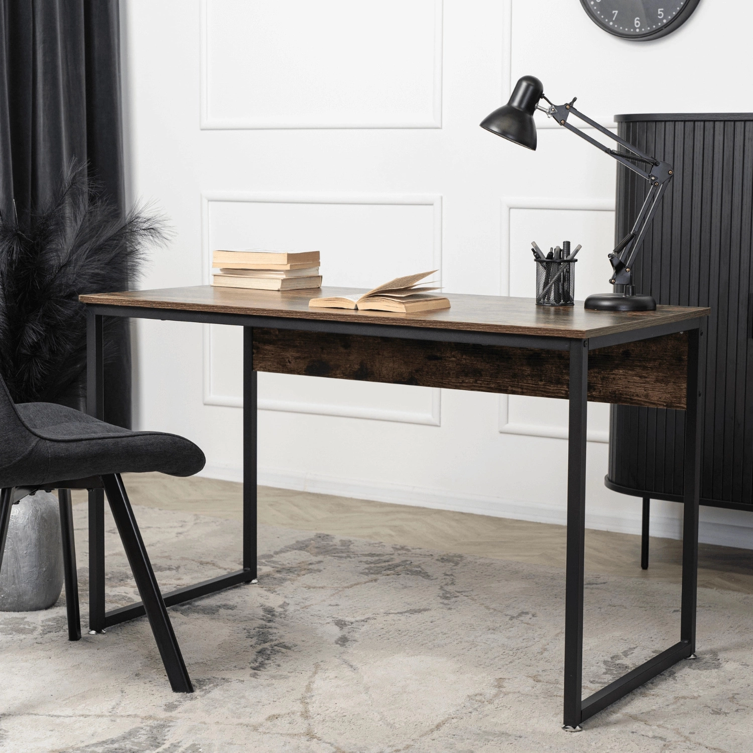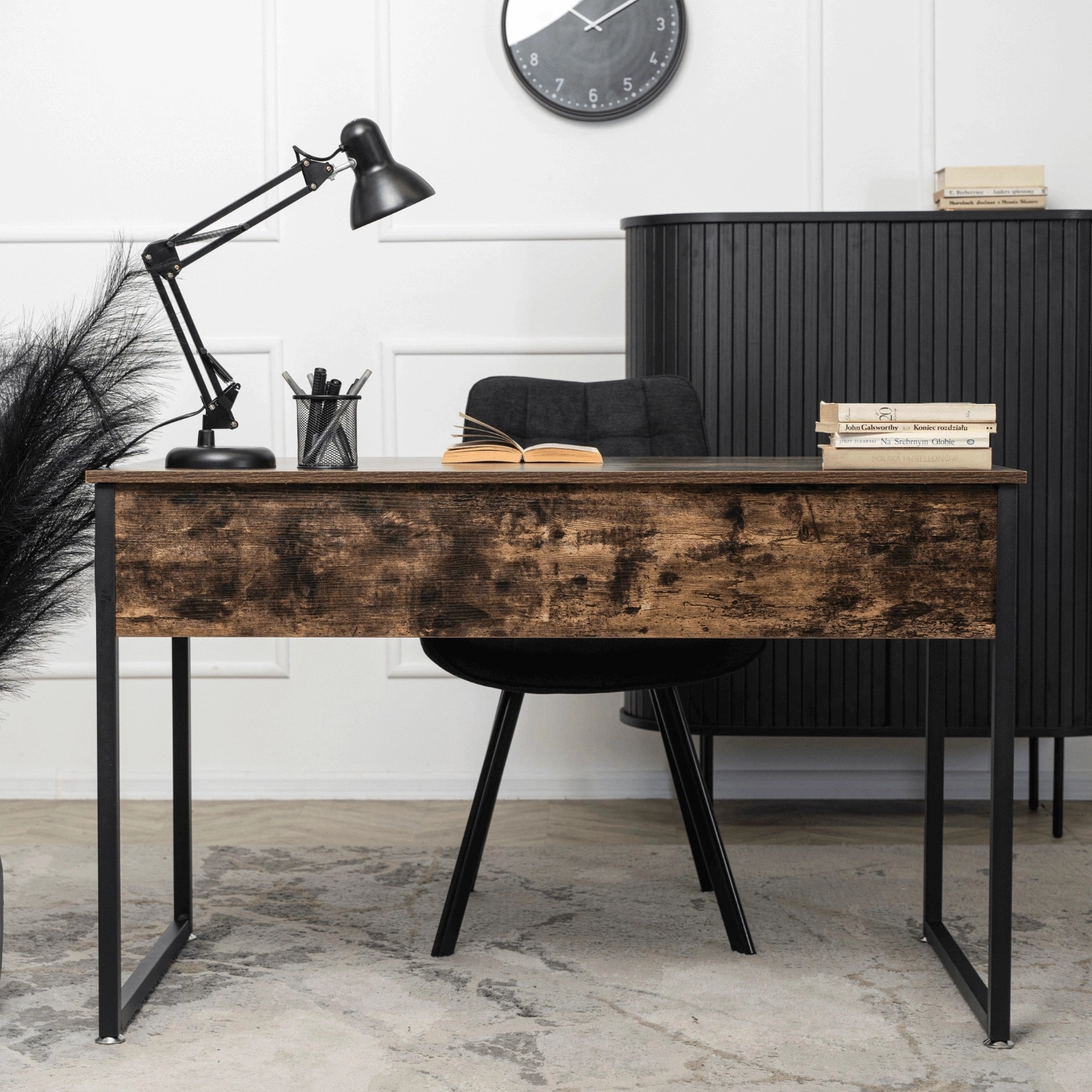 Stylowy blat w kolorze dębu rustykalnego wykonany z MDF, wprowadza do wnętrza ciepło i autentyczność, które doskonale współgrają z nowoczesnymi aranżacjami. Wytrzymała i elegancka metalowa podstawa w kolorze czerni, dodaje biurku industrialnego charakteru. Praktyczny blat pozwala na szybkie usunięcie zabrudzeń za pomocą wilgotnej ściereczki.