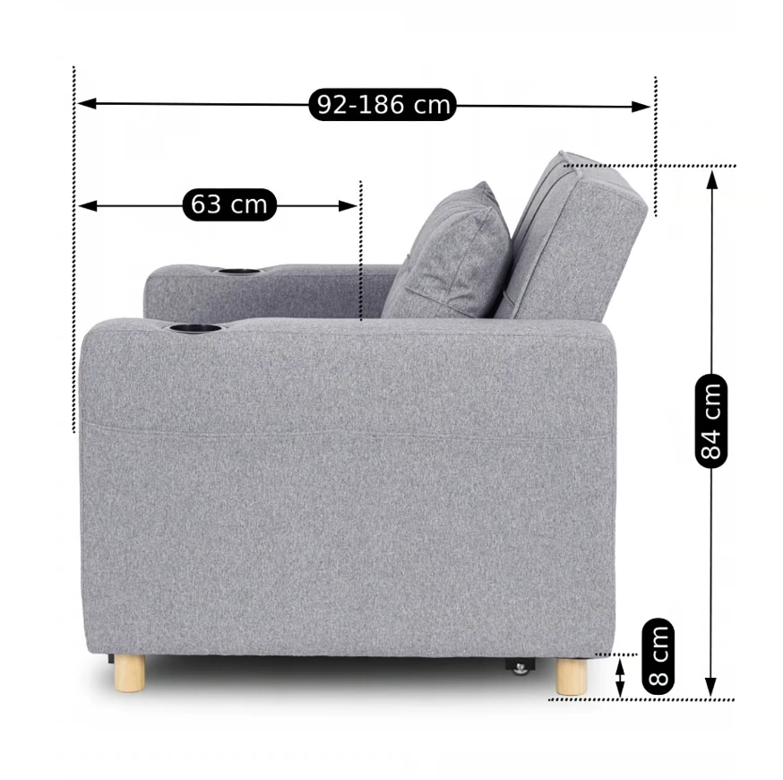 • Głębokość fotela po rozłożeniu: 186 cm – komfortowa długość, zapewniająca wygodne miejsce do spania.
