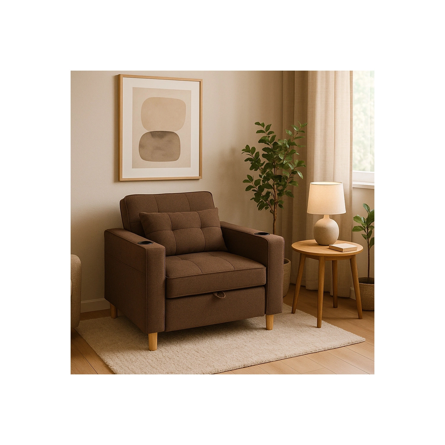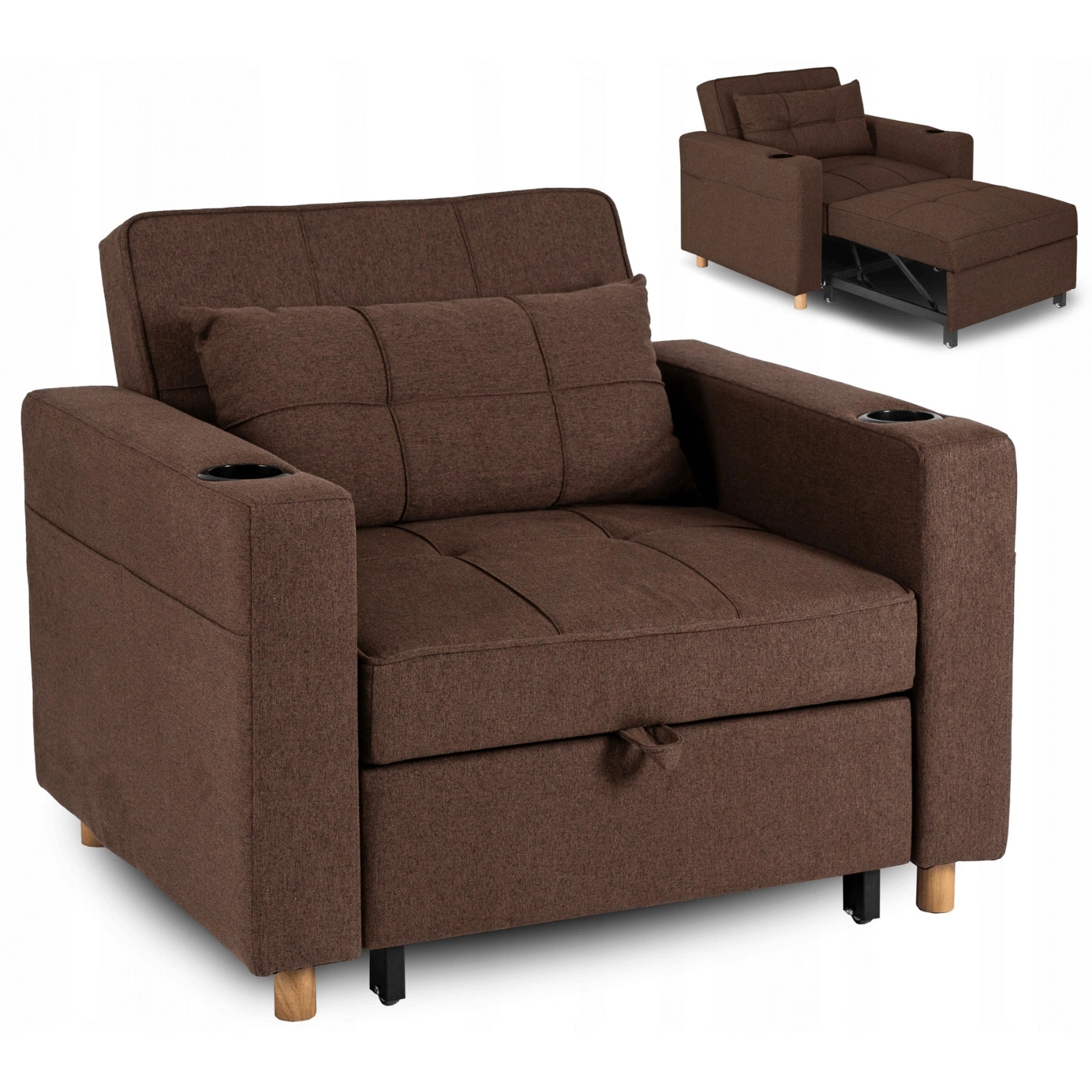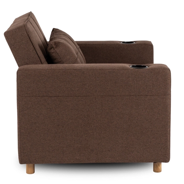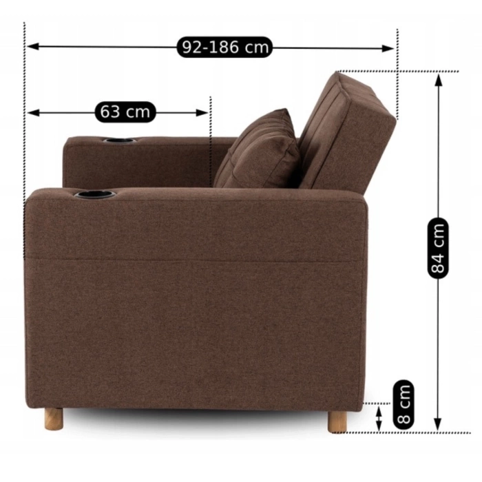 - Fotel Solor w kolorze brązowym to nowoczesny i funkcjonalny mebel, który w kilka chwil zmienia się z wygodnego fotela w praktyczne miejsce do odpoczynku. Świetnie sprawdza się w małych przestrzeniach.
