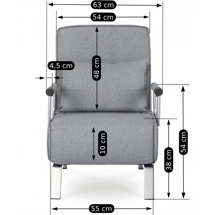 - Szerokość fotela: 63 cm – kompaktowy, idealny do różnych przestrzeni.