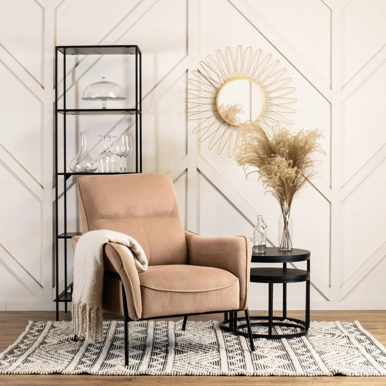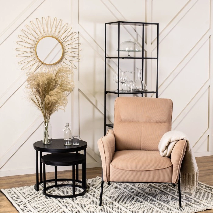 Minimalistyczna forma oraz modne połączenie beżowej tapicerki z czarnymi metalowymi nogami czynią fotel Alberto ponadczasowym dodatkiem do wnętrz urządzonych w stylu skandynawskim, loftowym i nowoczesnym. Jego prosta, a jednocześnie elegancka bryła sprawia, że świetnie komponuje się zarówno w salonie, jak i w sypialni czy domowym gabinecie. Dzięki niemu Twoja przestrzeń zyska nowoczesny, ale jednocześnie przytulny charakter.