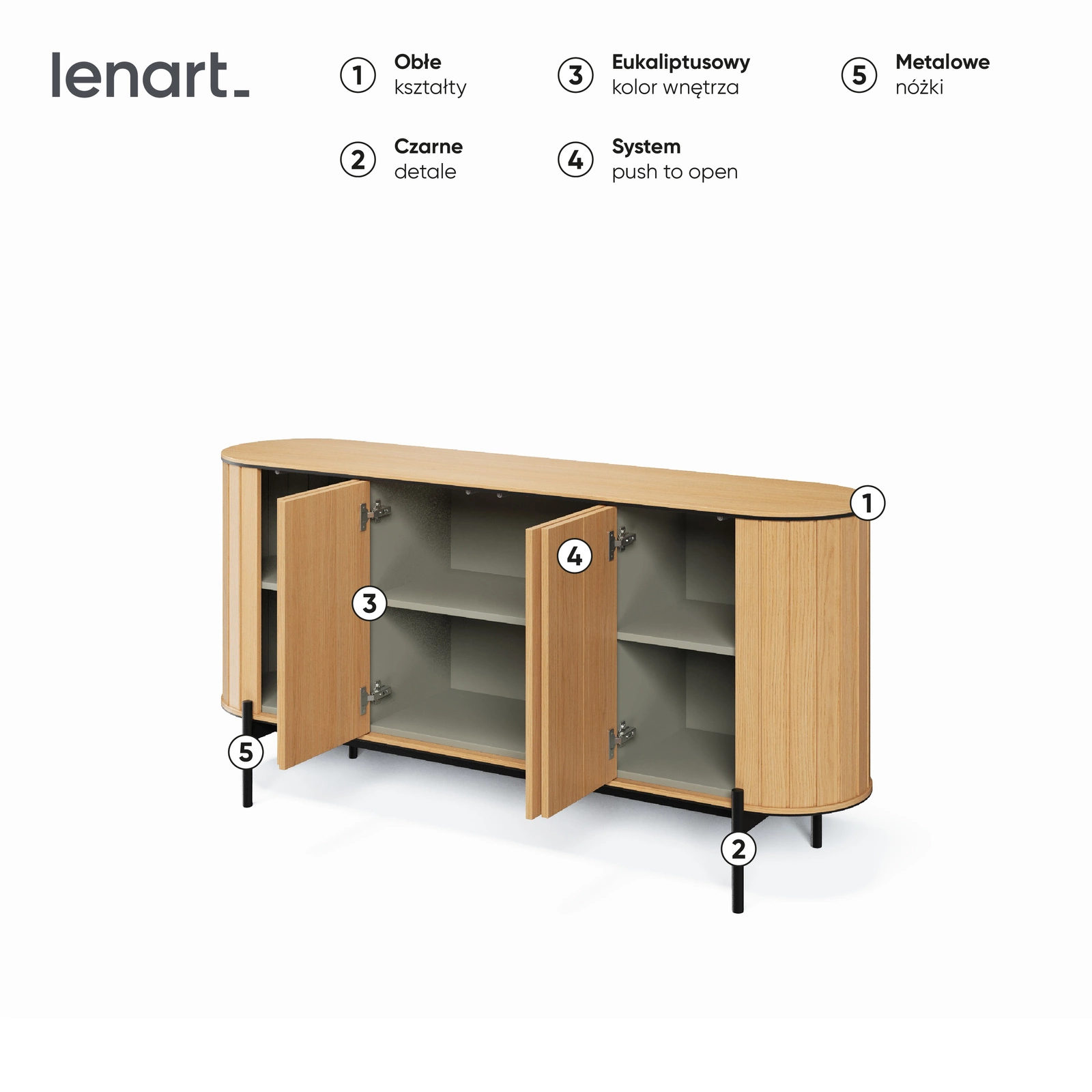 Komoda nowoczesna Rotto to połączenie wyrafinowanego stylu i codziennej praktyczności. Jej zaokrąglony design, nóżki w kolorze drewna i funkcjonalne wnętrze czynią z niej idealny wybór do każdego nowoczesnego mieszkania. Jeśli szukasz eleganckiej komody do salonu, która spełni zarówno estetyczne, jak i praktyczne wymagania – Rotto będzie strzałem w dziesiątkę.