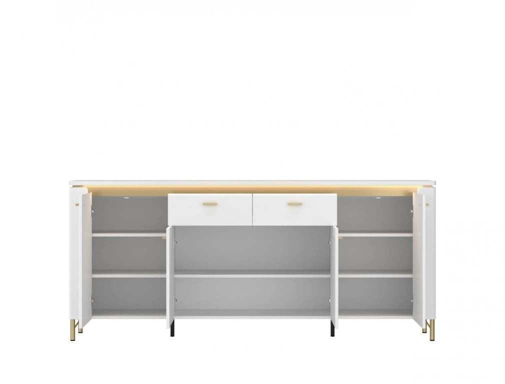 Duża komoda do salonu to nie tylko dekoracyjny element aranżacji, ale także praktyczne rozwiązanie do przechowywania. Cztery pojemne szafki oraz dwie wysuwane szuflady na prowadnicach kulkowych gwarantują łatwy dostęp do przechowywanych przedmiotów. System cichego domyku zapewnia komfortowe i bezgłośne użytkowanie.