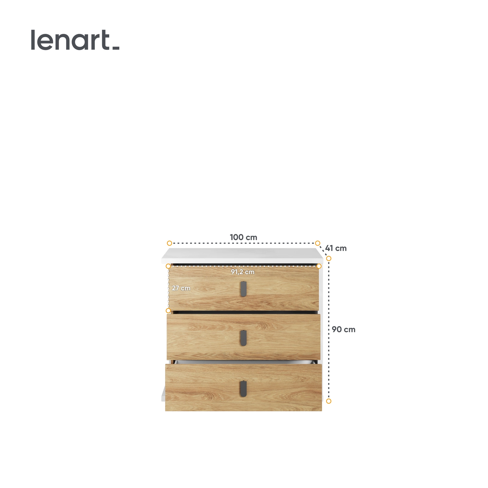 Dzięki szerokości 100 cm, wysokości 90 cm i głębokości 41 cm, komoda oferuje wystarczająco dużo miejsca do przechowywania – idealna na bieliznę, dokumenty, książki, akcesoria naukowe czy inne drobiazgi, które warto mieć pod ręką. Trzy przestronne i łatwo dostępne szuflady pozwalają zachować porządek i organizację.