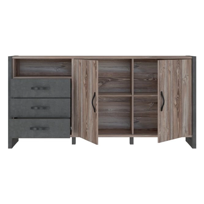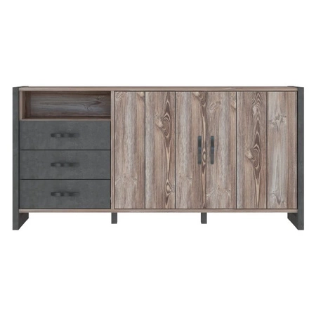 Wykonana z wysokiej jakości płyty wiórowej, komoda zachwyca połączeniem dwóch kontrastowych dekorów: ciepłej sosny oraz surowego ciemnoszarego betonu. Jej funkcjonalność zwiększa dobrze przemyślany układ: