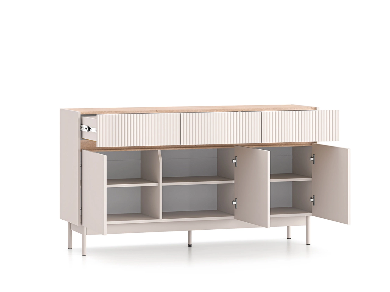 Szeroki blat pozwala na stylową ekspozycję dekoracji – wazonów, ramek, świec czy pamiątek z podróży. Komfort użytkowania zapewniają szuflady z pełnym wysuwem, zawiasy z cichym domykaniem oraz solidne, metalowe nóżki, które gwarantują trwałość i stabilność. Eleganckie wykończenie w kolorze kaszmirowym z dekorem Dąb Cremona podkreśla nowoczesny charakter mebla i sprawia, że komoda pasuje do różnych aranżacji wnętrz.