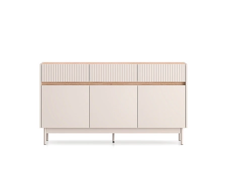 Duża komoda Dunea 05 to doskonałe rozwiązanie do przechowywania w salonie, sypialni, jadalni lub przedpokoju. Dzięki trzem pojemnym szufladom i sześciu wnękom ukrytym za potrójnymi drzwiczkami, z łatwością pomieścisz ubrania, tekstylia domowe, zastawę stołową czy dokumenty. To idealny wybór dla tych, którzy cenią sobie funkcjonalność i estetykę w jednym.