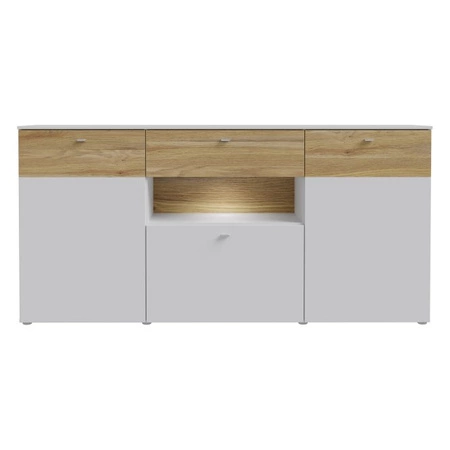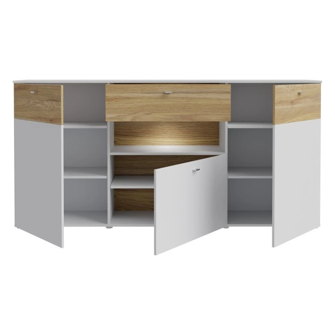 Komoda COMO marki FORTE to połączenie nowoczesnego stylu, wysokiej jakości wykonania oraz praktycznych rozwiązań do przechowywania. Dzięki trzem pojemnym szafkom, jednej szufladzie i otwartej wnęce ten mebel doskonale sprawdzi się w salonie, jadalni czy domowym biurze.