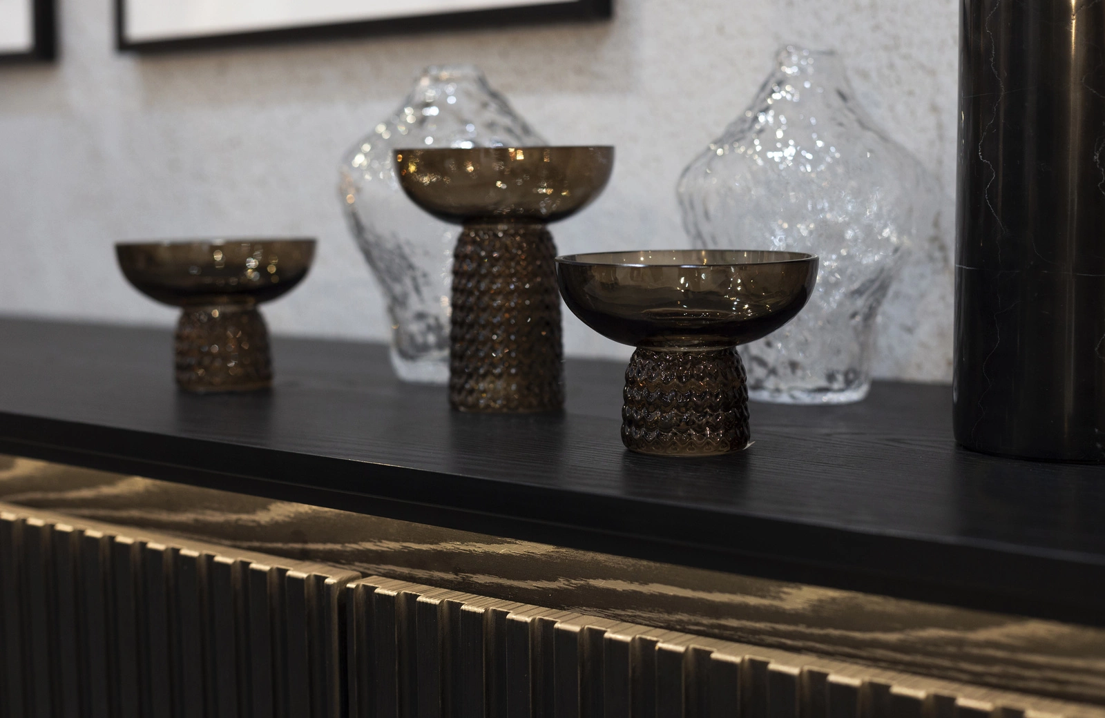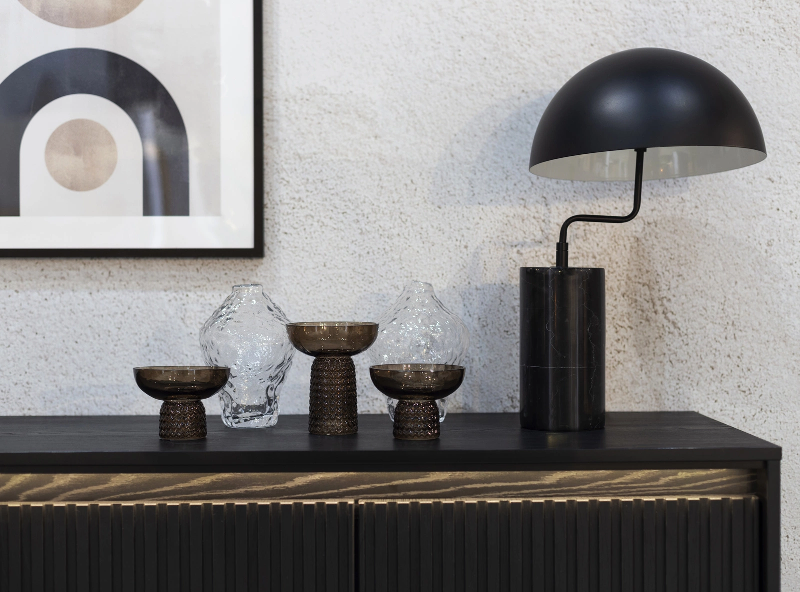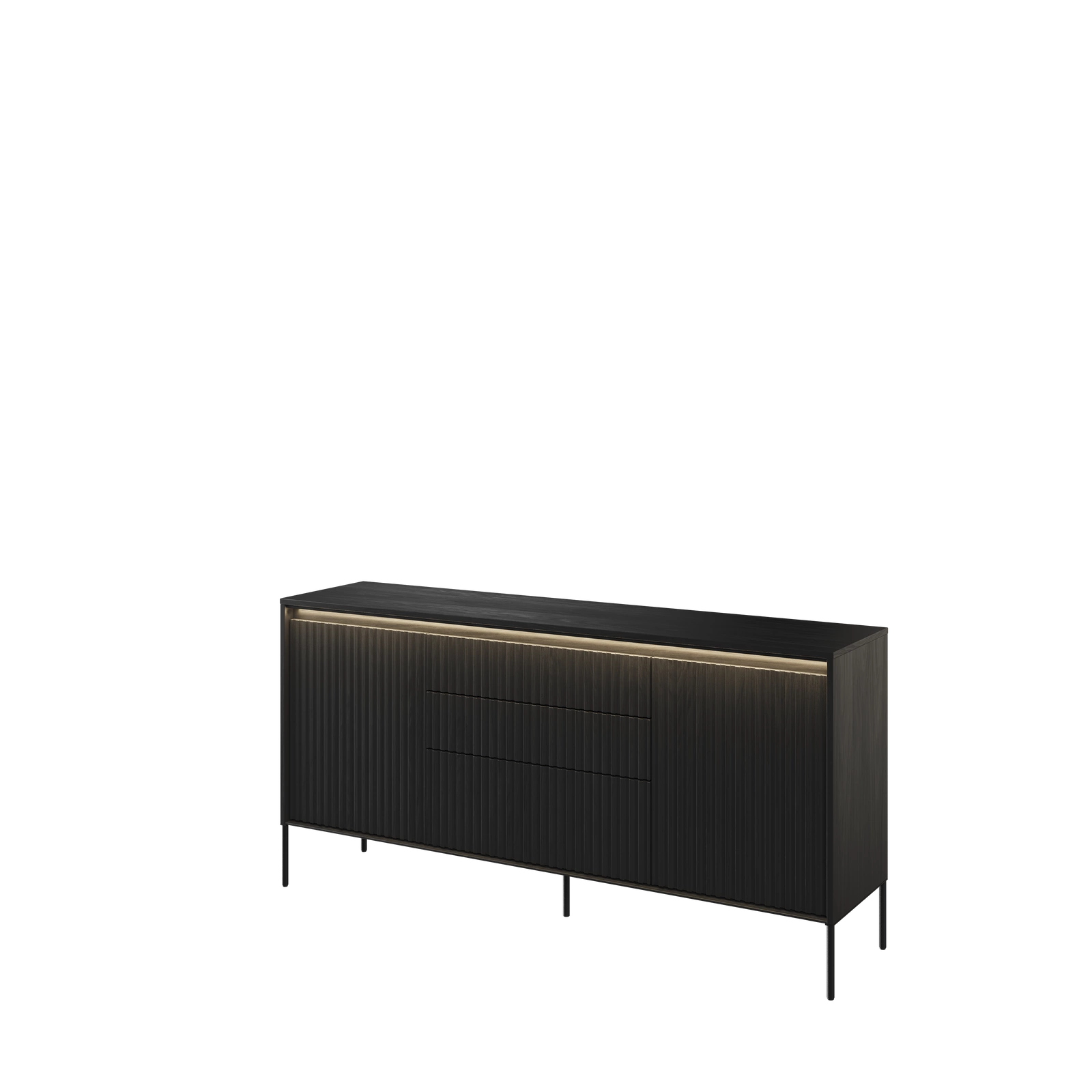 Komoda opiera się na smukłych metalowych nóżkach, które zapewniają jej stabilność i jednocześnie nadają wizualnej lekkości. Dzięki temu świetnie sprawdzi się również w mniejszych pomieszczeniach, nie przytłaczając wnętrza. Subtelne oświetlenie LED podkreśla przestrzenność frontów i dodaje eleganckiego, wieczornego klimatu.