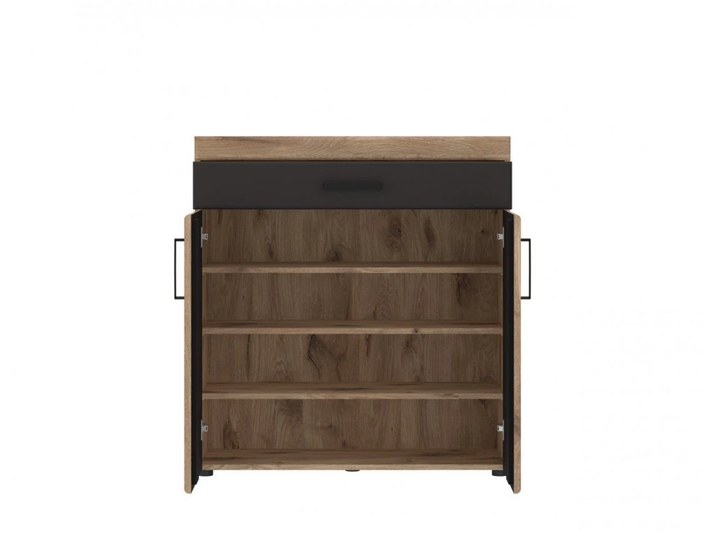 Dzięki dwudrzwiowej konstrukcji z szufladą masz możliwość organizacji wszystkich niezbędnych rzeczy. Cztery przestronne półki pozwalają na wygodne przechowywanie odzieży, dokumentów czy innych domowych akcesoriów. Szuflada z pełnym wysuwem na kulkowych prowadnicach zapewnia łatwy dostęp do zawartości, a zawiasy z cichym domykiem gwarantują komfortowe użytkowanie.