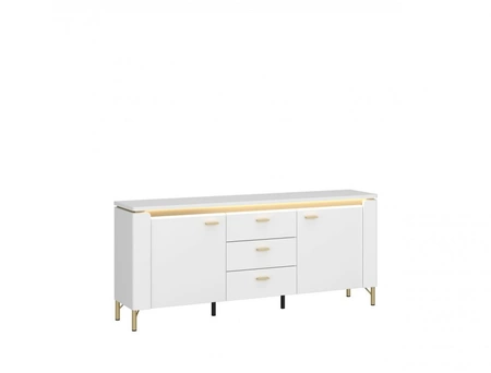 Biel w połysku, subtelne złote akcenty nadają elegancki i nowoczesny wygląd. Minimalistyczna bryła na wysokich, złotych nóżkach dodaje lekkości, a stylowe metalowe uchwyty podkreślają wyrafinowany styl glamour. Szafka RTV Lazio pasuje do wnętrz urządzonych w stylu nowoczesnym, klasycznym, glamour oraz hampton. Stanowi doskonałe uzupełnienie aranżacji i przyciąga wzrok, stając się centralnym punktem strefy wypoczynkowej.
