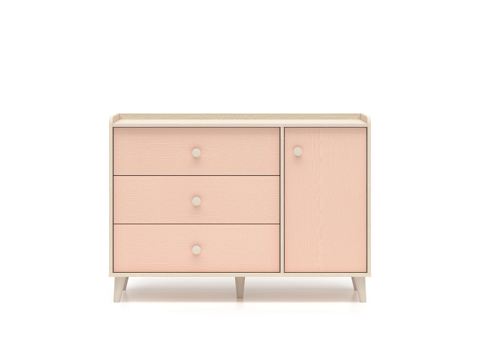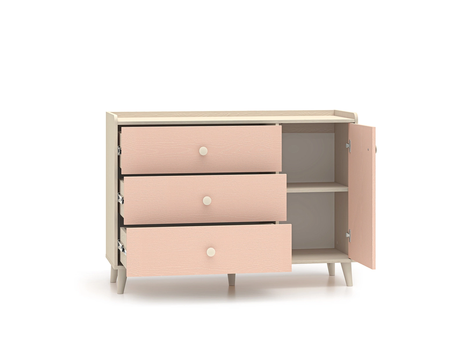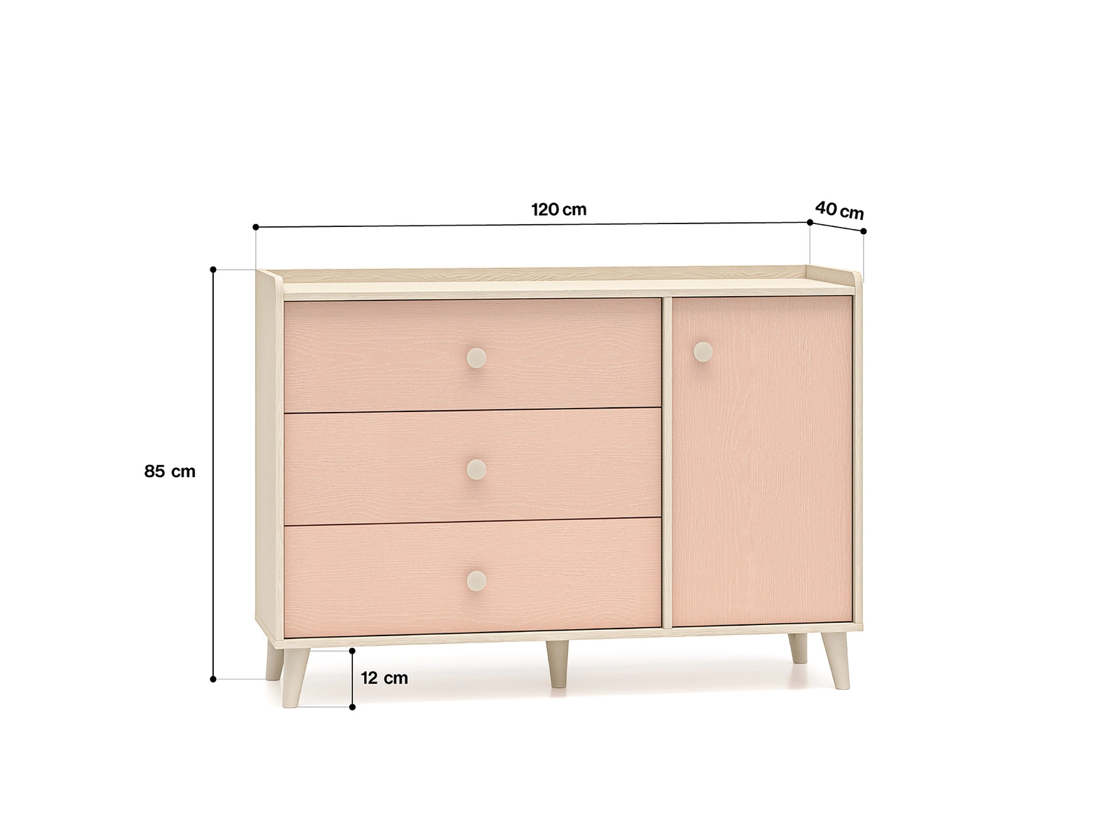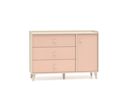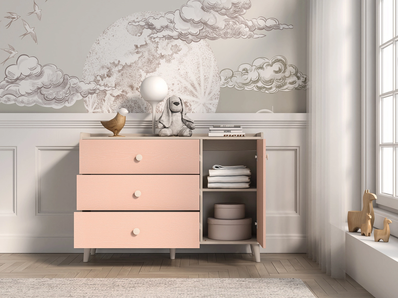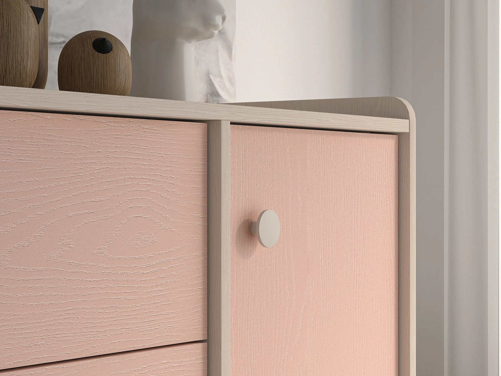 Komoda do pokoju młodzieżowego Mevel wyróżnia się eleganckim połączeniem jasnego beżu z delikatnym różem. Korpus w odcieniu naturalnego drewna nadaje wnętrzu ciepła i przytulności, natomiast fronty szuflad i szafki w subtelnym różowym tonie dodają meblowi nowoczesnego charakteru. Idealna propozycja do pokoju młodzieżowego w stylu skandynawskim czy minimalistycznym.
