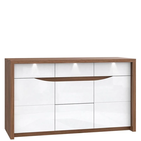 Szeroka komoda posiada eleganckie i stylowe zestawienie kolorów, dodatkowo podkreślone oświetleniem, co daje ciepły, domowy wystrój każdemu pomieszczeniu. Nowoczesny mebel świetnie sprawdzi się w sypialni, salonie czy pokoju dziennym. Będzie ona atrakcyjnym akcentem, a jednocześnie zwiększy funkcjonalność wnętrza.