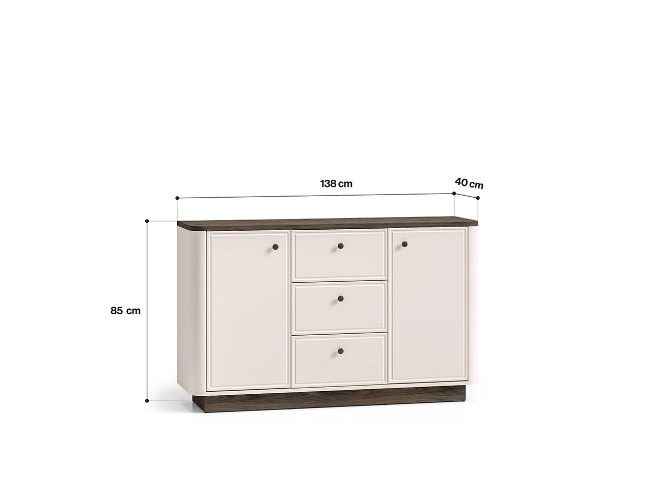 - Komoda Vilavio 04 to funkcjonalny i elegancki mebel do salonu. Wyposażona w cztery pojemne wnęki oraz trzy szuflady, zapewnia wygodne przechowywanie. Stylowe wykończenie w kolorze Dąb Windmill Dark i Cashmere podkreśla nowoczesny charakter mebla.