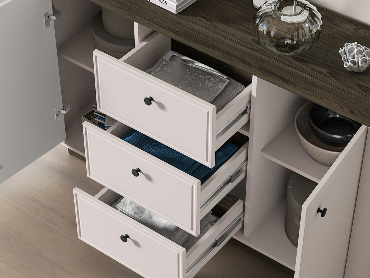 Komoda Vilavio 04 to idealne rozwiązanie do przechowywania w salonie lub sypialni. Przemyślany układ wnętrza, pojemne szuflady oraz zamykane wnęki sprawiają, że mebel łączy estetykę z codzienną funkcjonalnością, pomagając utrzymać porządek w domowej przestrzeni.