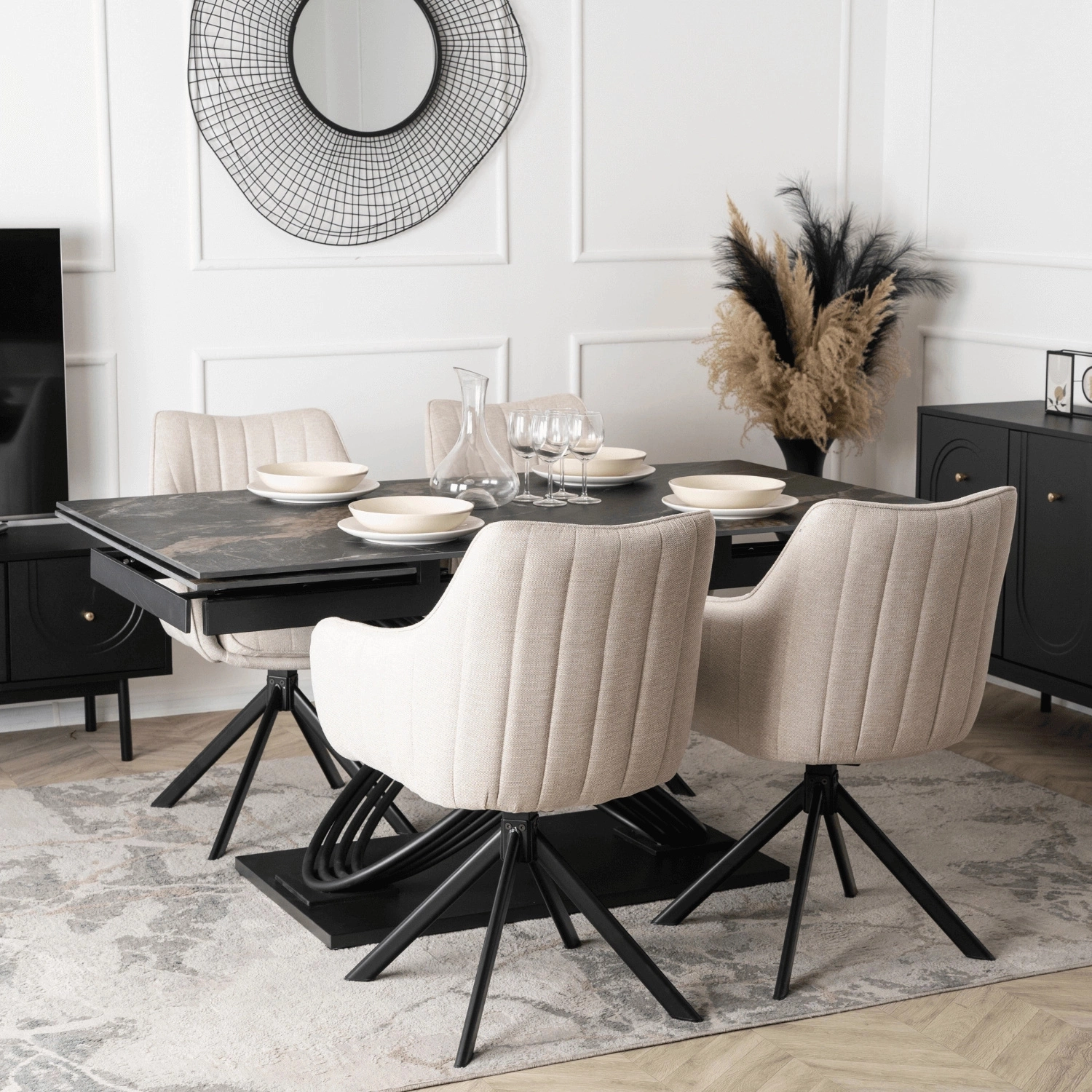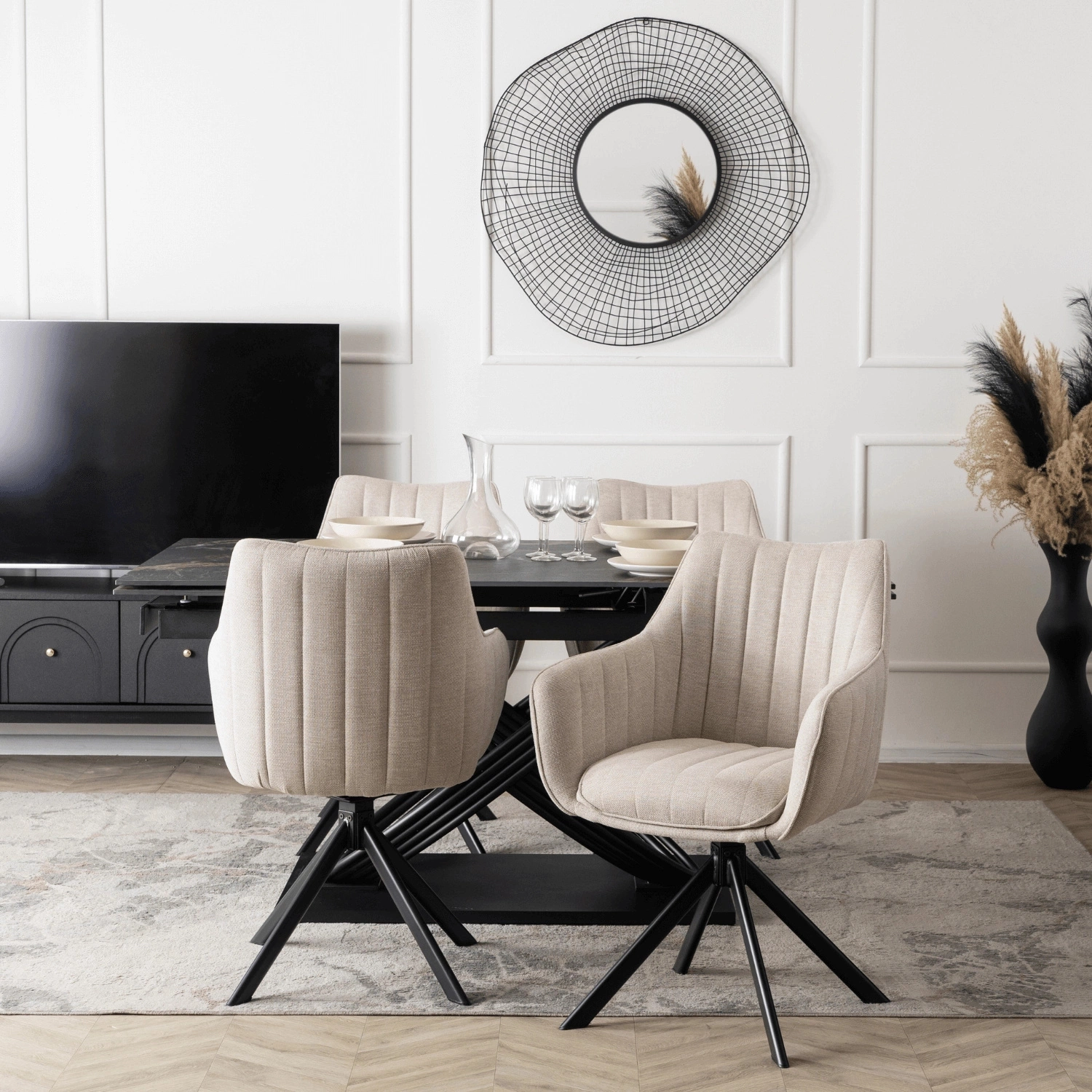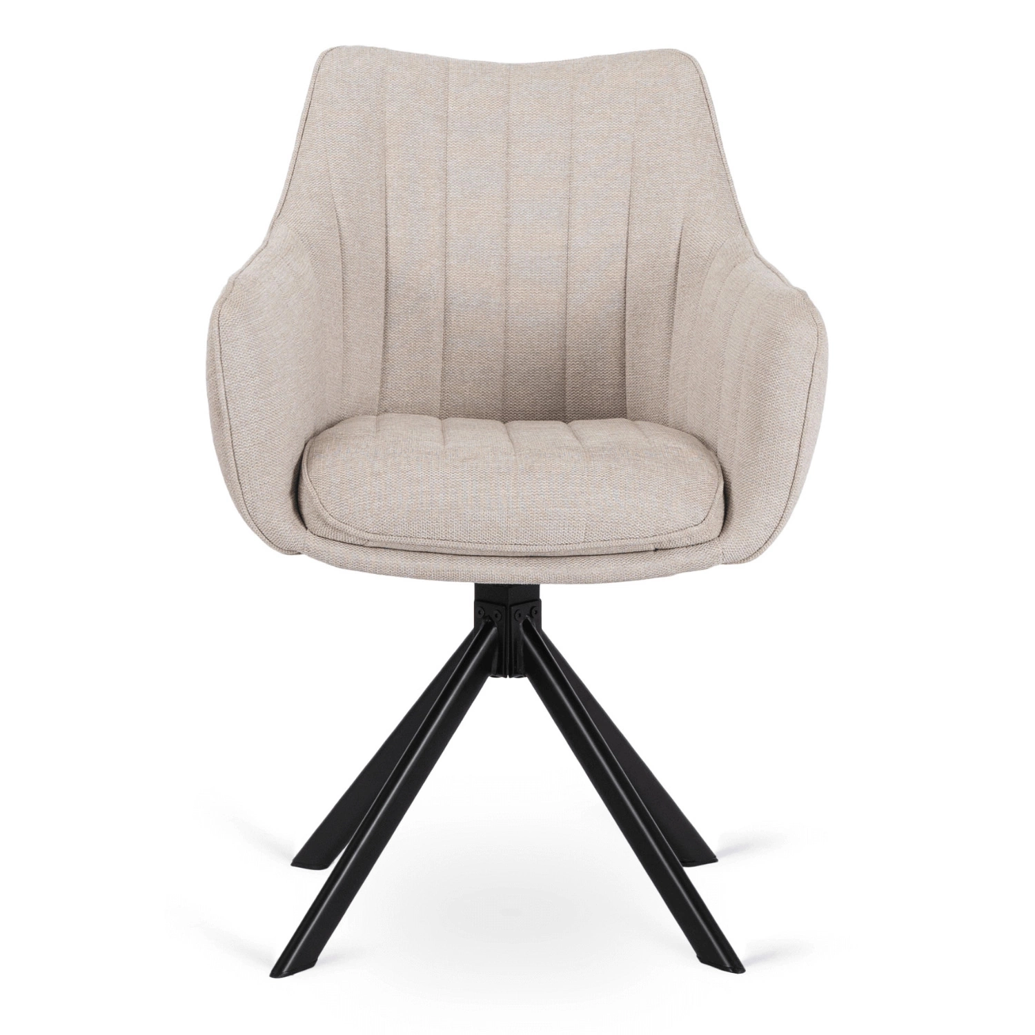 - Eleganckie i wygodne krzesło obrotowe w kremowym kolorze, tapicerowane miękką tkaniną. Posiada solidną, czarną metalową podstawę zapewniającą stabilność.Doskonałe do jadalni, biura lub salonu, łącząc nowoczesny design z funkcjonalnością.