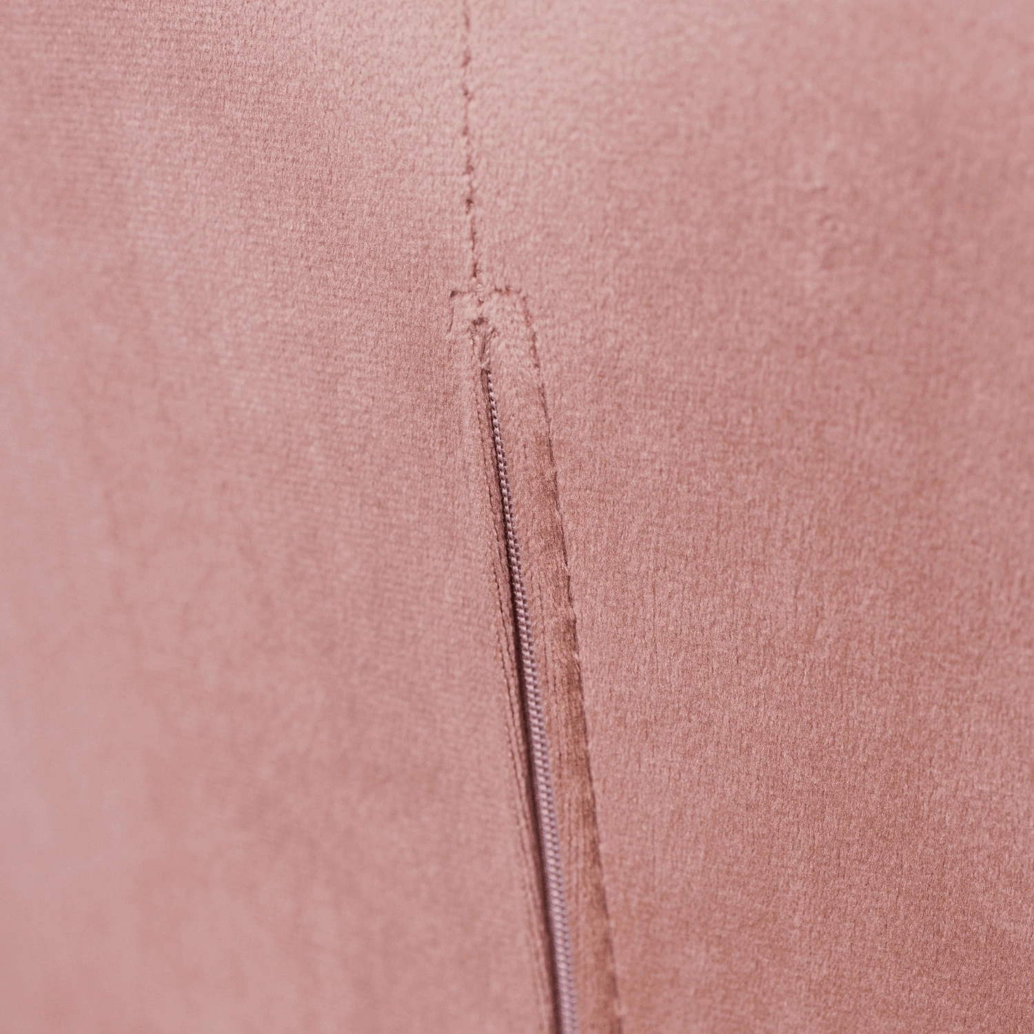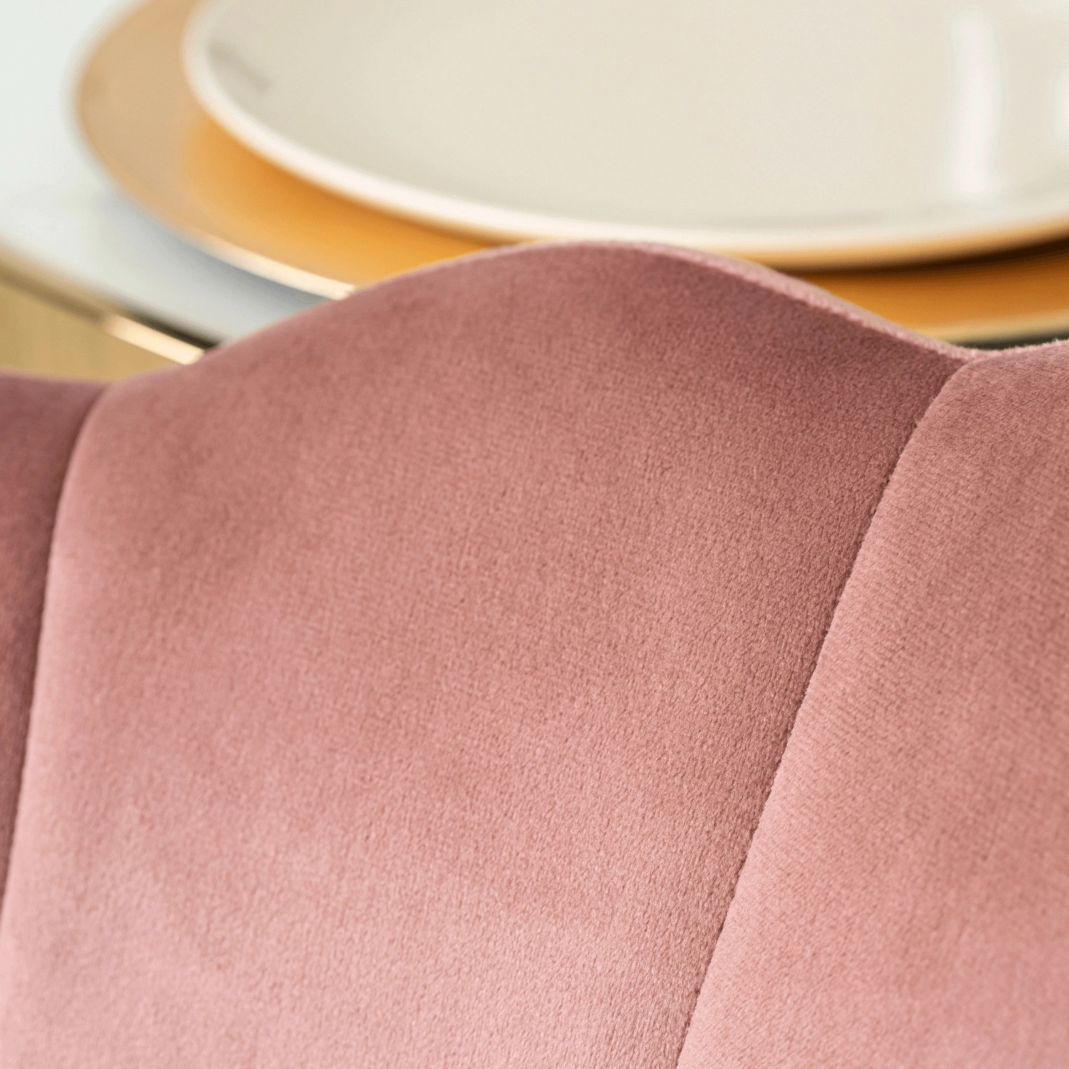 Nowoczesny, welurowy mebel w stylu glamour, idealny do jadalni, toaletki lub salonu. Różowa tapicerka z miękkiego weluru zapewnia luksusowy wygląd i komfort, a złote, metalowe nogi podkreślają jego elegancję i trwałość.