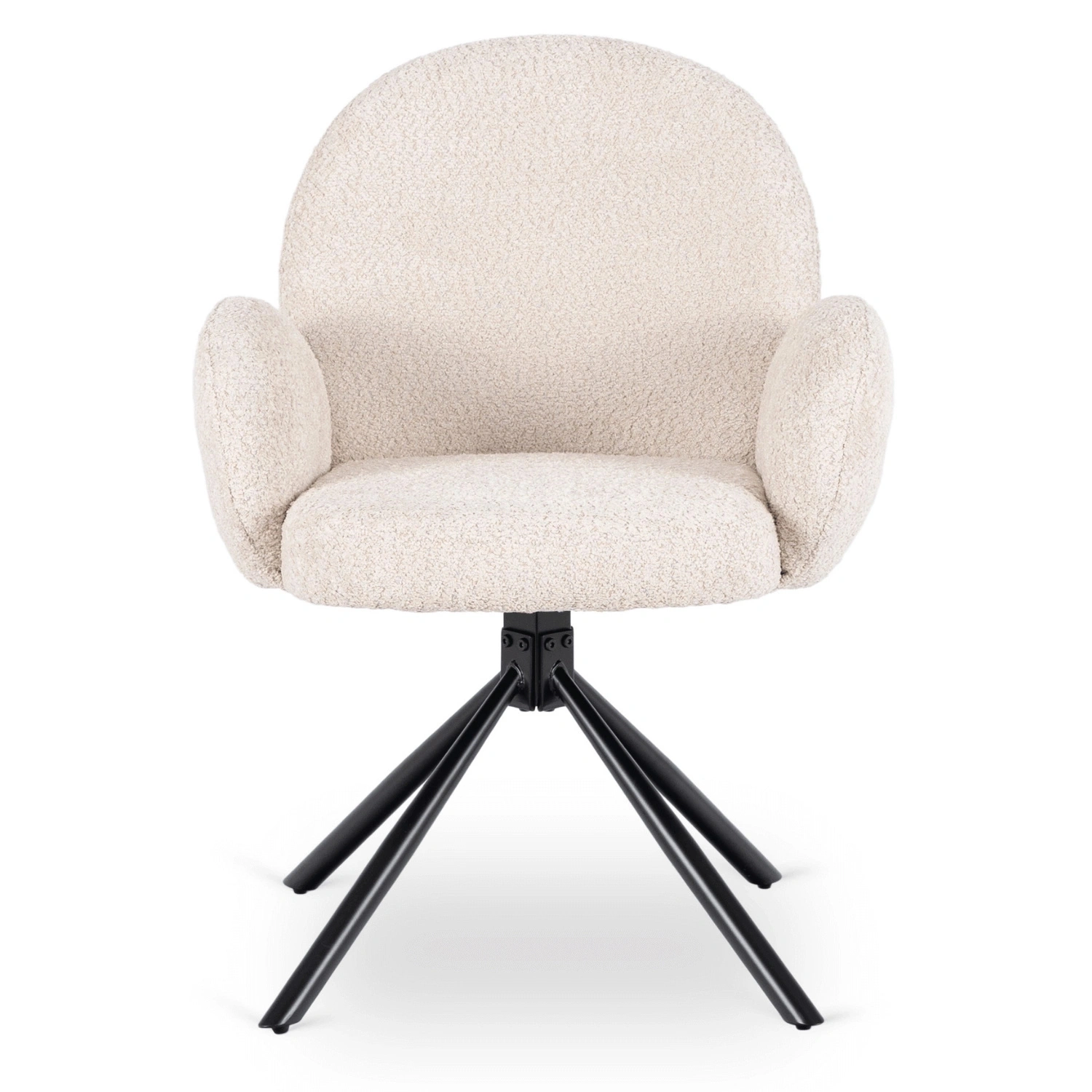• Musso to eleganckie obrotowe krzesło tapicerowane do jadalni w kolorze beżowym, które łączy miękką tkaninę boucle z nowoczesną formą. Dzięki funkcji obrotu 180° z automatycznym powrotem zapewnia wygodę i swobodę użytkowania