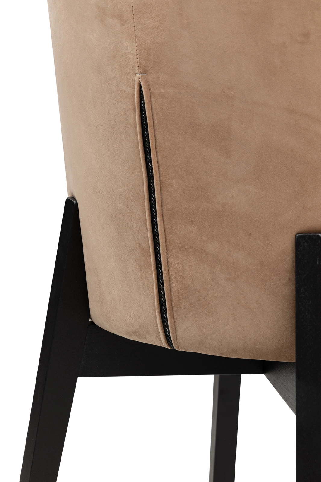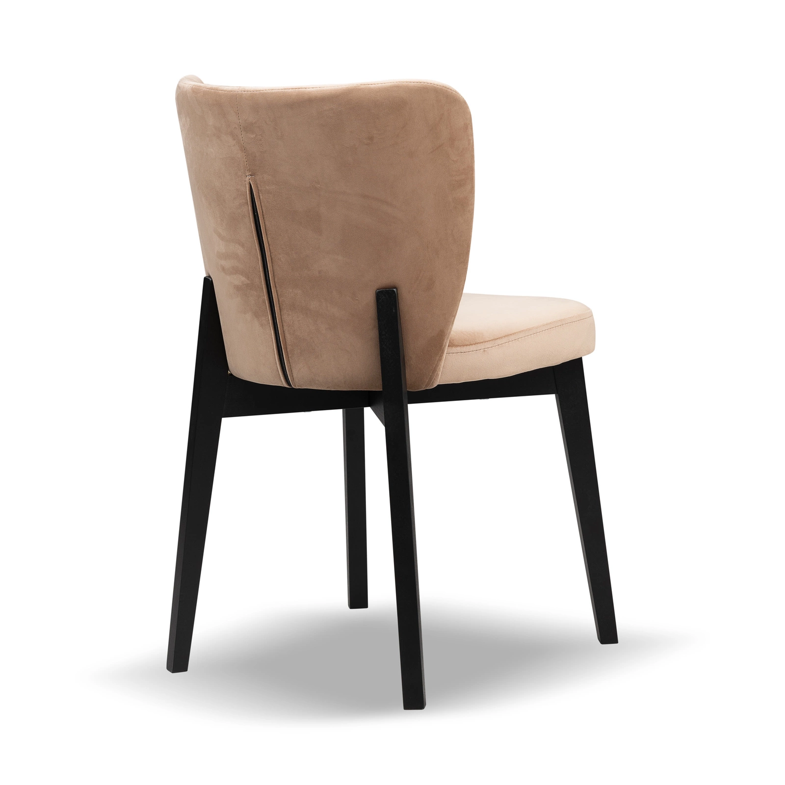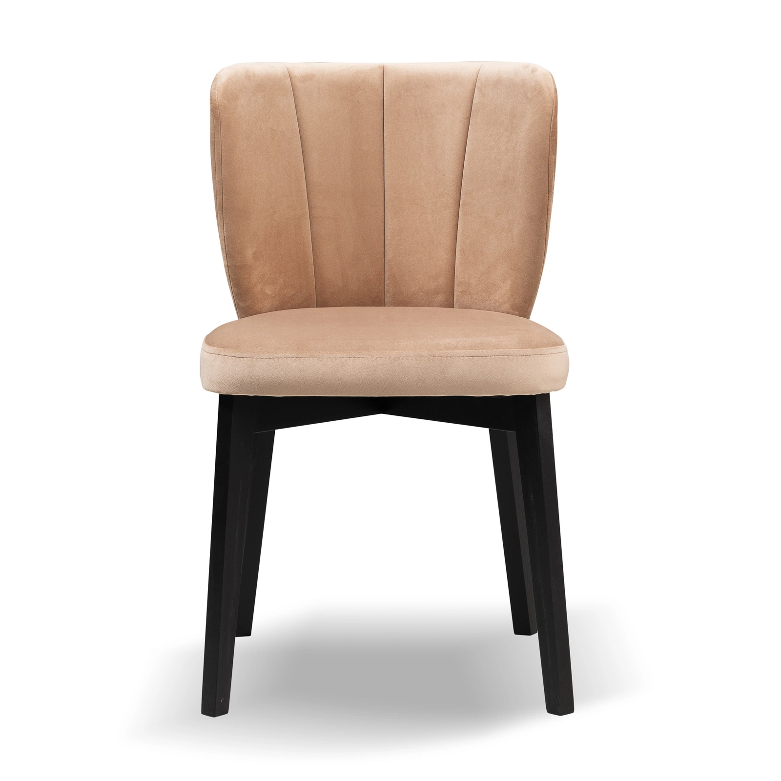 Miękkie siedzisko i oparcie pokryte przyjemną w dotyku tkaniną zapewniają komfort nawet podczas dłuższych spotkań przy stole. Subtelne pionowe przeszycia na oparciu dodają charakteru, podkreślając nowoczesny styl krzesła. Solidna konstrukcja na czterech drewnianych nogach w kolorze czarnym gwarantuje stabilność i trwałość na lata.