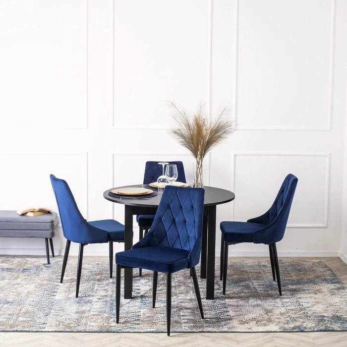 - Krzesło tapicerowane w eleganckim, granatowym welurze, który dodaje klasy każdemu wnętrzu.