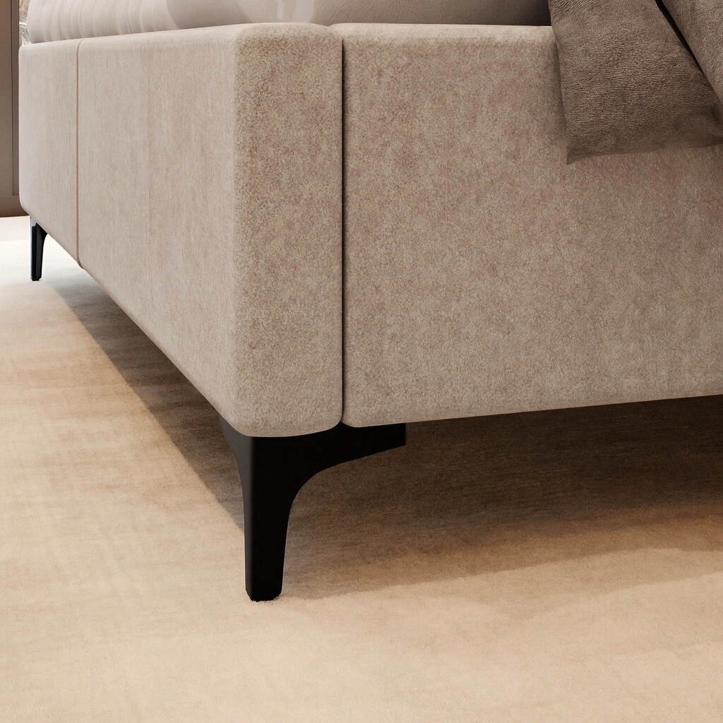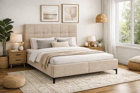 Łóżko Sereno to połączenie elegancji, komfortu oraz nowoczesnego wzornictwa. Model został wykonany z wysokiej jakości tkaniny Claud 03, która cechuje się przyjemną w dotyku strukturą, trwałością oraz łatwością w utrzymaniu czystości. Neutralny, ciepły odcień sprawia, że łóżko doskonale wpisuje się zarówno w klasyczne, jak i nowoczesne sypialnie.