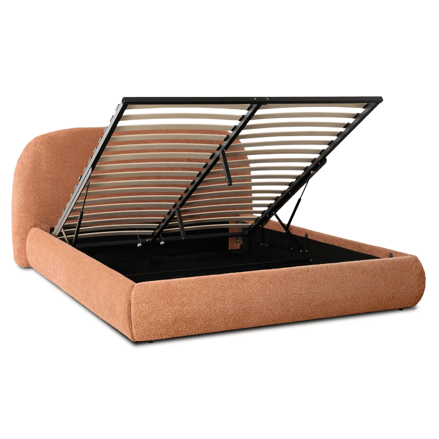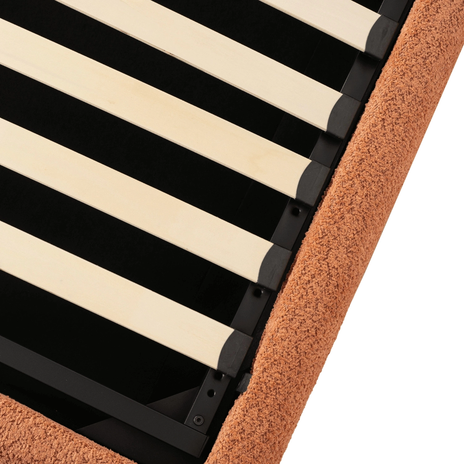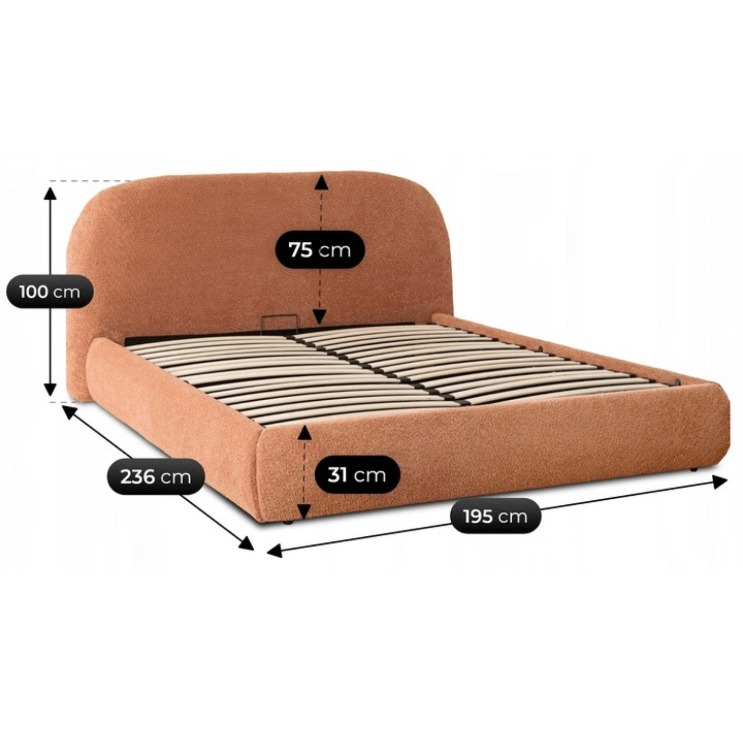 - Łóżko tapicerowane Rosso 160 × 200 w rudej tkaninie boucle łączy elegancję z wygodą. Miękka tapicerka i wysokie wezgłowie zapewniają komfort, a podnoszony stelaż z dużym pojemnikiem ułatwia przechowywanie.