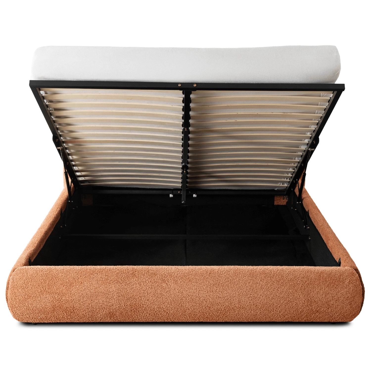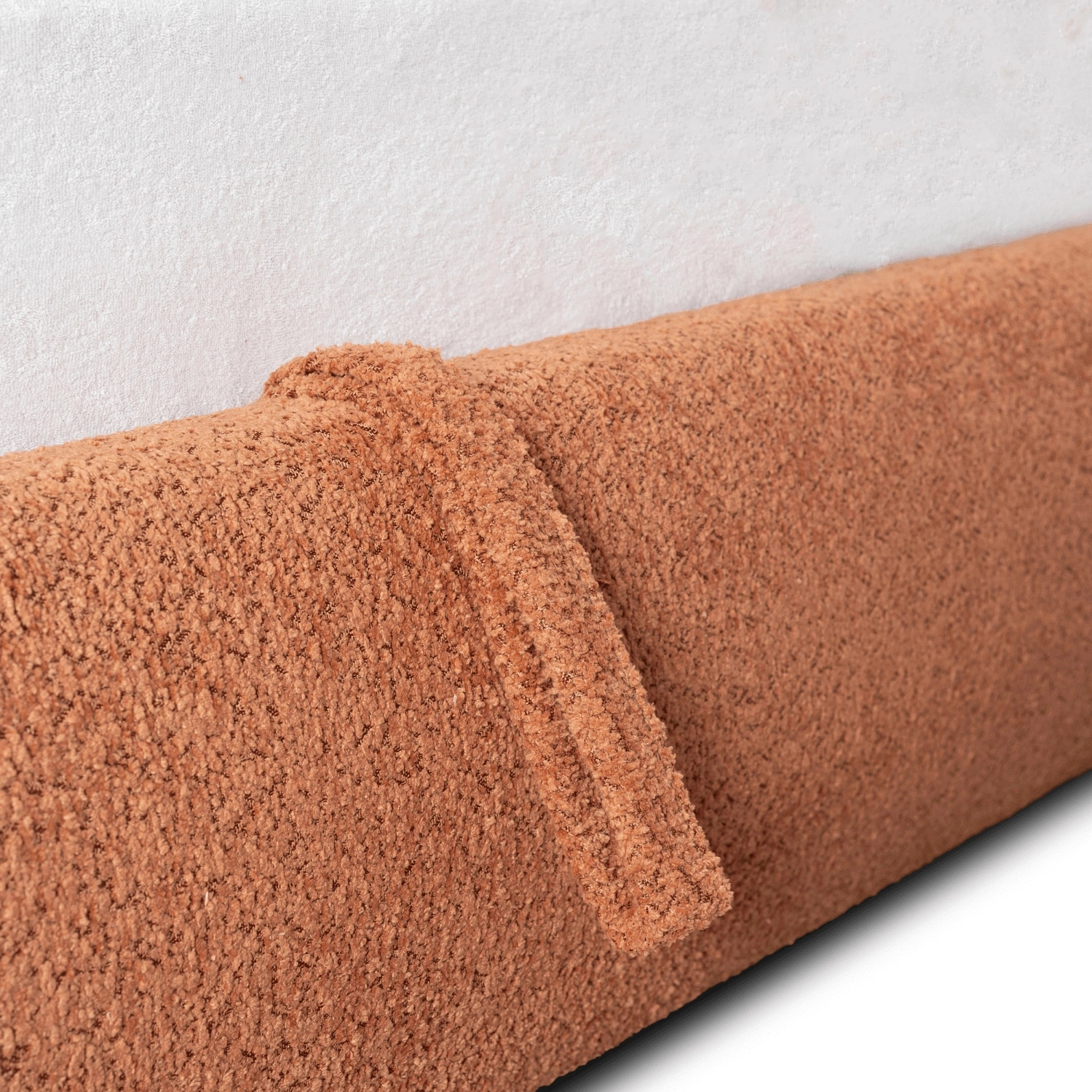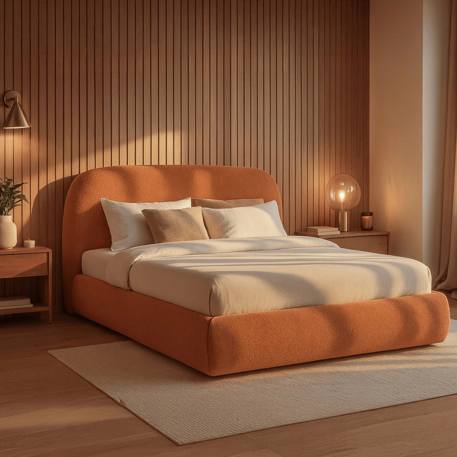 - Łóżko tapicerowane Rosso 160 × 200 w rudej tkaninie boucle łączy elegancję z wygodą. Miękka tapicerka i wysokie wezgłowie zapewniają komfort, a podnoszony stelaż z dużym pojemnikiem ułatwia przechowywanie.