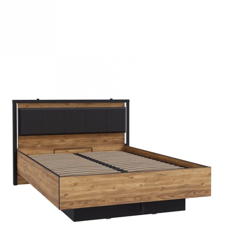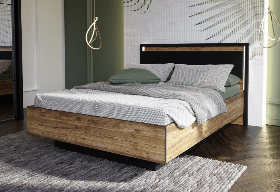 Łóżko Hayato wyróżnia się harmonijnym połączeniem dekoru Czarny / Świerk alpejski oraz aksamitnej, czarnej tkaniny na tapicerowanym zagłówku. Dzięki temu doskonale komponuje się z wnętrzami w nowoczesnym i minimalistycznym stylu. Stabilna konstrukcja oraz eleganckie wykończenie sprawiają, że będzie centralnym punktem każdej sypialni.