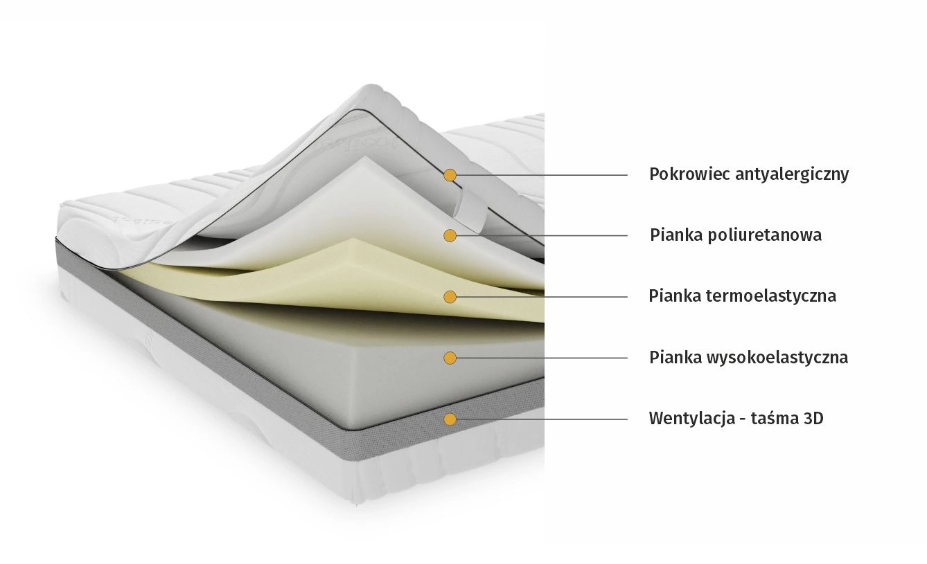 Pianka termoplastyczna pod wpływem temperatury ciała, w miejscu jego styku z materacem idealnie dopasowuje się do kształtów, dzięki czemu nie ma mowy o odrętwieniu i uciskach. Zastosowane rozwiązanie gwarantuje doskonały sen w każdej pozycji. Sprawdzi się zatem u osób, które lubią spać nie tylko na plecach lub brzuchu, ale także na boku.