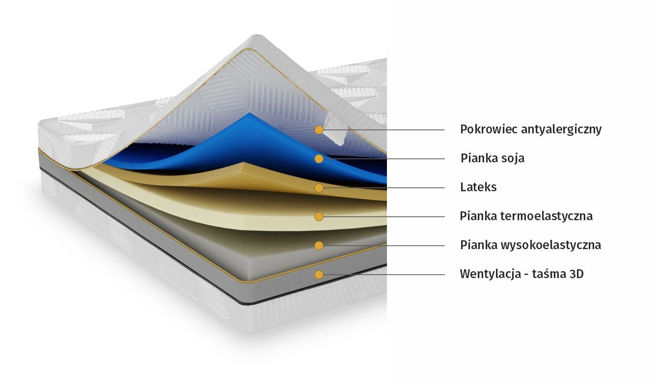- Pianka termoplastyczna- dopasowuje się do budowy ciała pod wpływem temperatury. Idealnie do wszystkich pozycji snu (dla śpiących na boku, na plecach, na brzuchu). Nie przenosi drgań, otula i sprawia wrażenie unoszenia. Odpręża i odciąża mięśnie kręgosłupa. Nie jest zalecana dla osób przegrzewających się podczas snu.