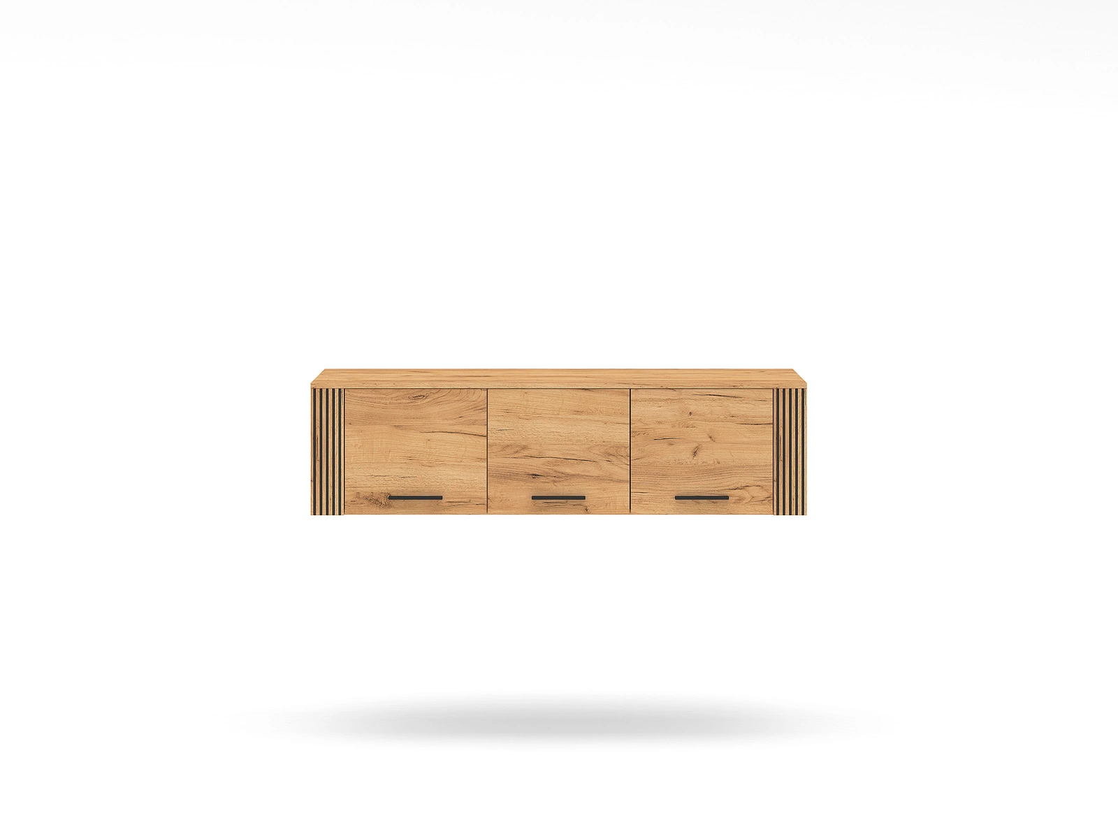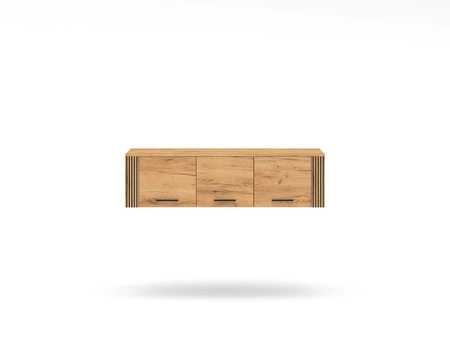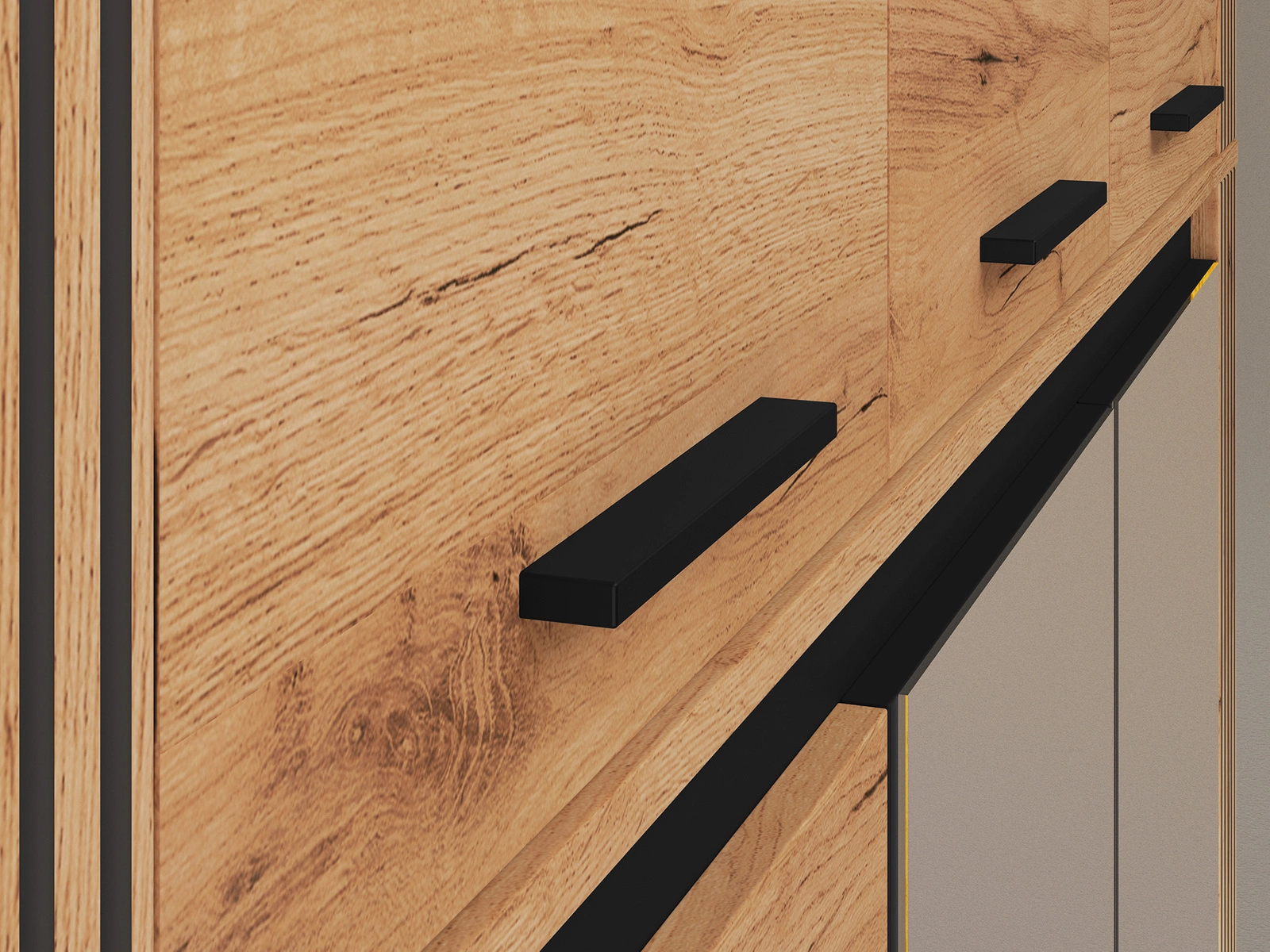 Nadstawka URSO 11 wykonana została w dekorze dąb craft złoty – ciepłym, naturalnym odcieniu, który dodaje wnętrzu przytulności i harmonii. Faktura drewna podkreśla autentyczność materiału, a poziome frezowania boczne oraz czarne uchwyty wprowadzają subtelny akcent nowoczesności.