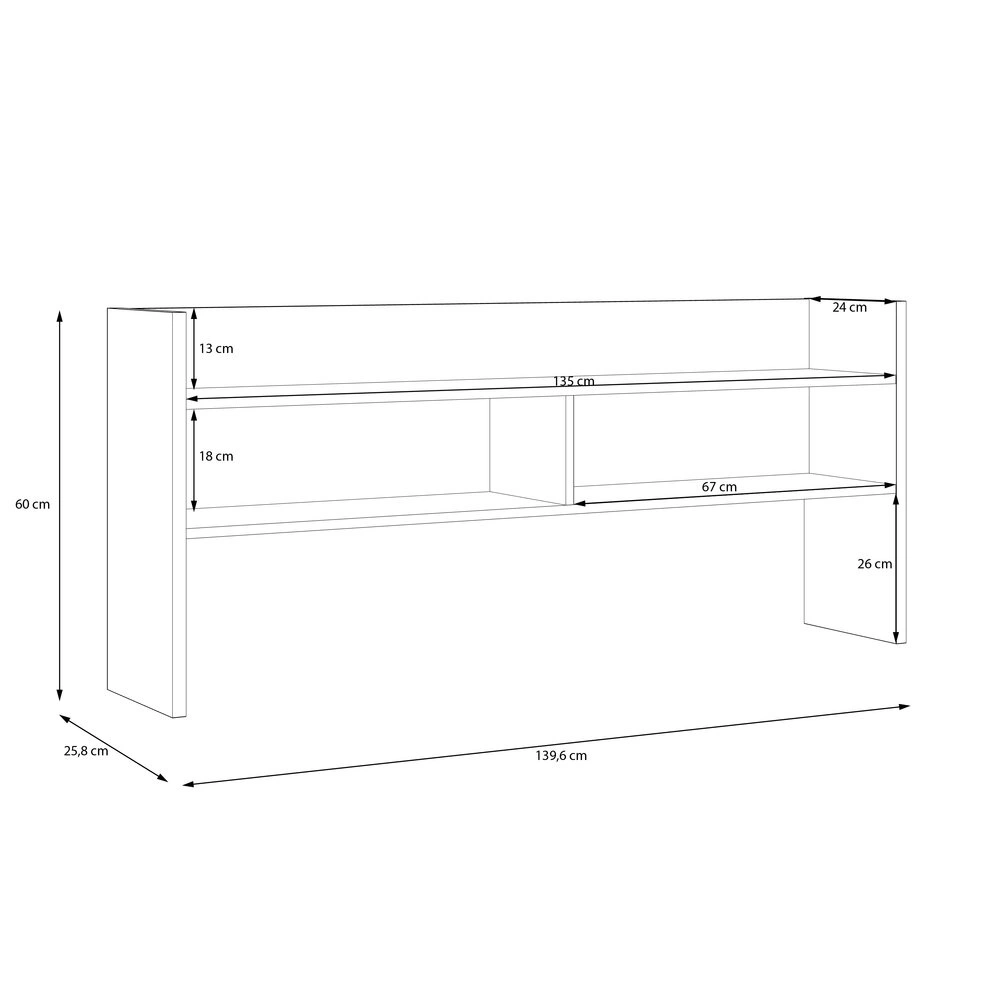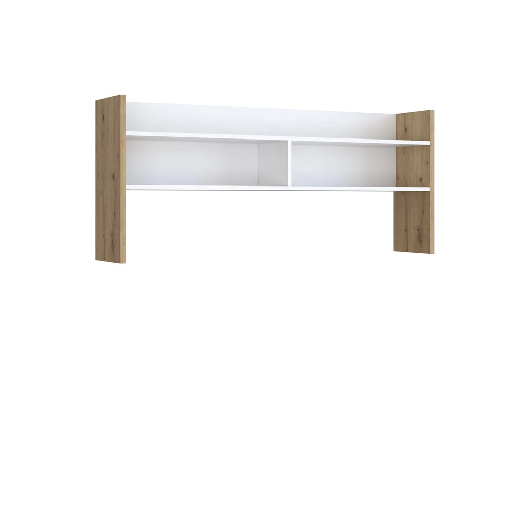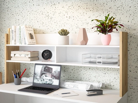Nadstawka MODULTRICK rozbuduje funkcjonalność Twojego biurka. Dzięki kilku sekcjom, półki pomieszczą zarówno biurowe akcesoria, jak i dekoracje, takie jak rośliny, zegar czy ceramiczne figurki. Jasne wykończenie nadstawki idealnie współgra z białym biurkiem o szerokości 110 cm.