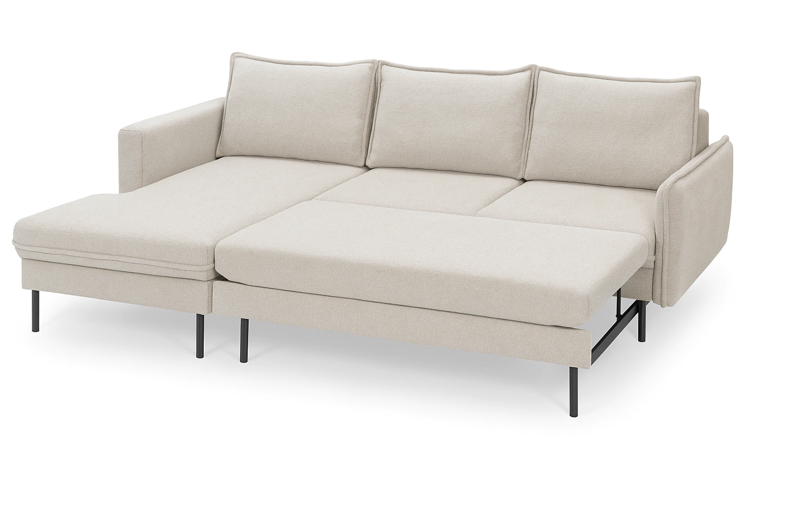 Narożnik Bjork jest wyposażony w funkcję spania, co sprawia, że z łatwością zamienisz go w dodatkowe łóżko dla gości. Dodatkowo, posiada pojemnik na pościel, który umożliwia wygodne przechowywanie, pomagając utrzymać porządek w salonie. To idealne rozwiązanie dla osób ceniących sobie praktyczność połączoną z nowoczesnym stylem.