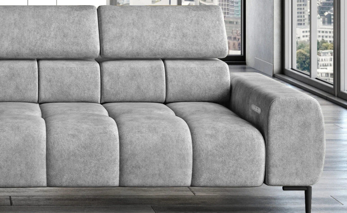 elektrycznie regulowaną głębokość siedziska, dzięki której z łatwością dopasujesz sofę do pozycji siedzącej lub półleżącej,