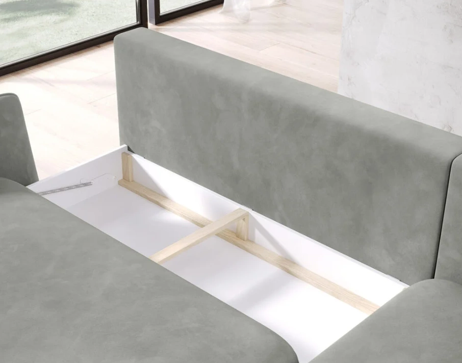 • Praktyczny pojemnik na pościel – dyskretny schowek, który pozwala utrzymać porządek w salonie,