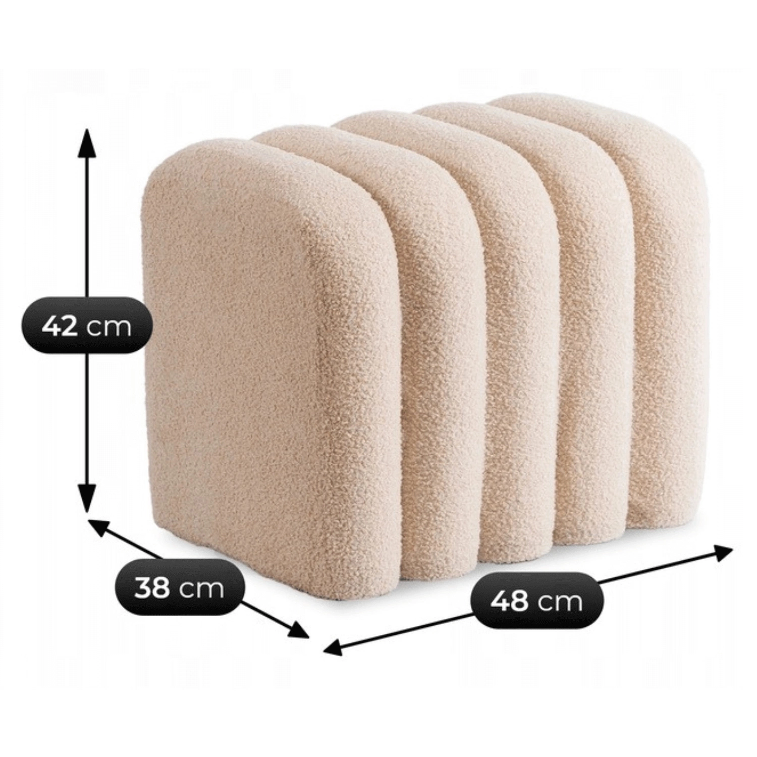 Dzięki kompaktowym wymiarom – wysokość 42 cm, szerokość 48 cm i głębokość 38 cm – pufa świetnie sprawdzi się zarówno w większych, jak i mniejszych przestrzeniach. Doskonale pasuje do salonu, przedpokoju, sypialni, a nawet pokoju młodzieżowego. Może pełnić funkcję dodatkowego siedziska, podnóżka lub stylowego akcentu dekoracyjnego.