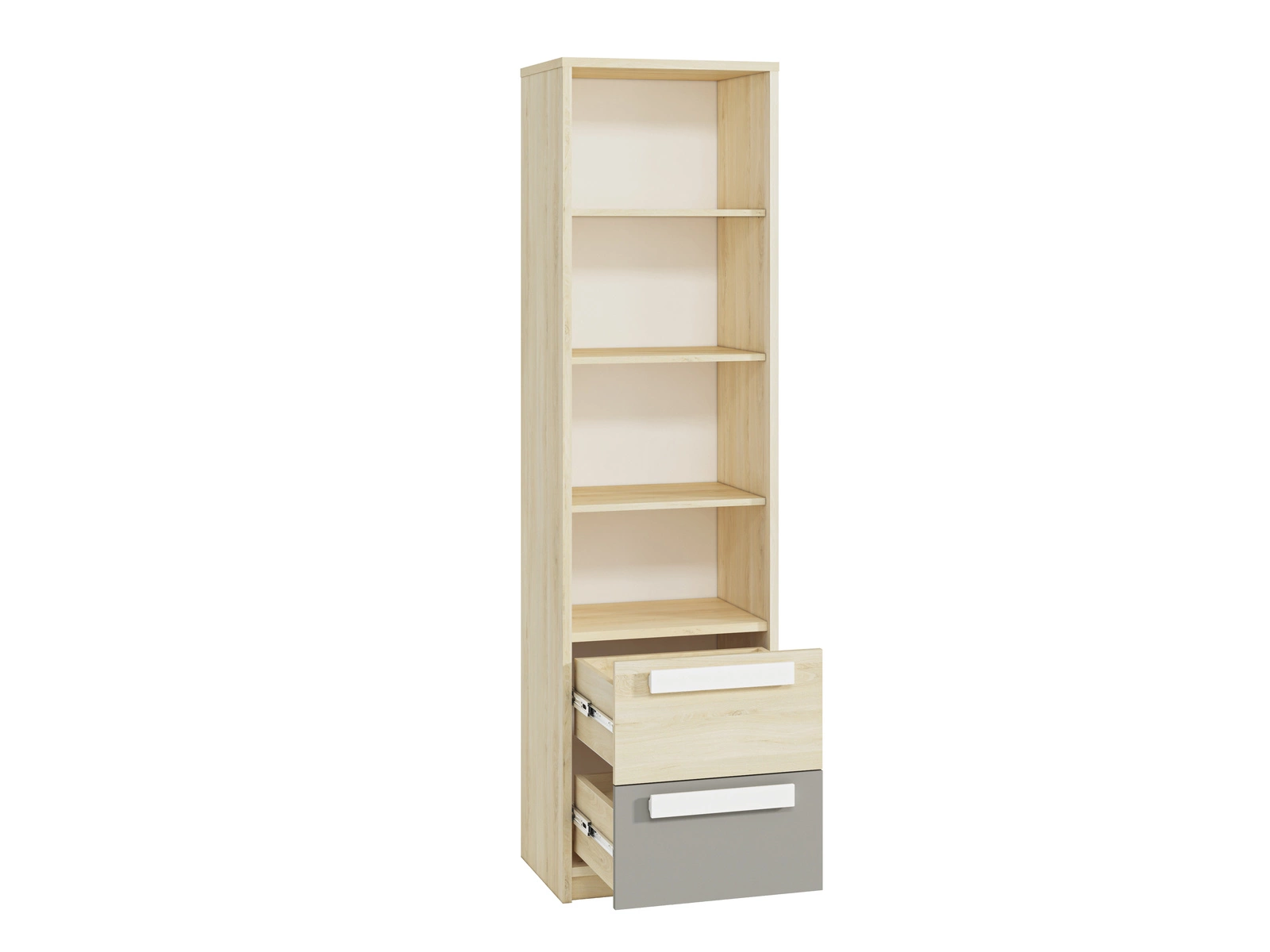 Regał posiada cztery pojemne półki oraz dwie szuflady w modnym połączeniu kolorów: Buk Fjord, Biały i Szara Platyna. Wykonany z trwałych materiałów, gwarantuje stabilność i długotrwałe użytkowanie. Minimalistyczny design i nowoczesna kolorystyka sprawiają, że mebel będzie pasował zarówno do wnętrz w stylu skandynawskim, jak i nowoczesnym.