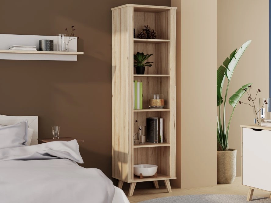 Stylowy dekor Deska Dębowa w połączeniu z akcentami w kolorze Białym tworzy subtelny, skandynawski klimat, który wpisuje się zarówno w nowoczesne, jak i klasyczne aranżacje. Regał opiera się na smukłych nóżkach, co dodaje mu lekkości i ułatwia utrzymanie czystości pod meblem.