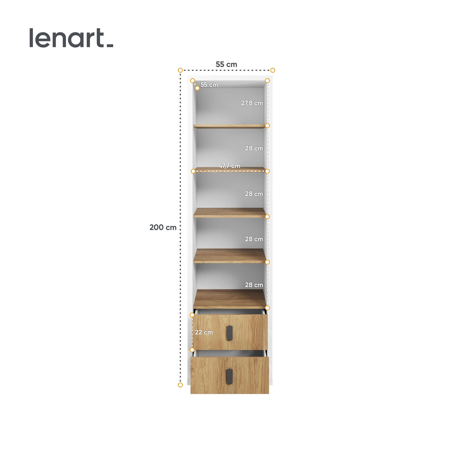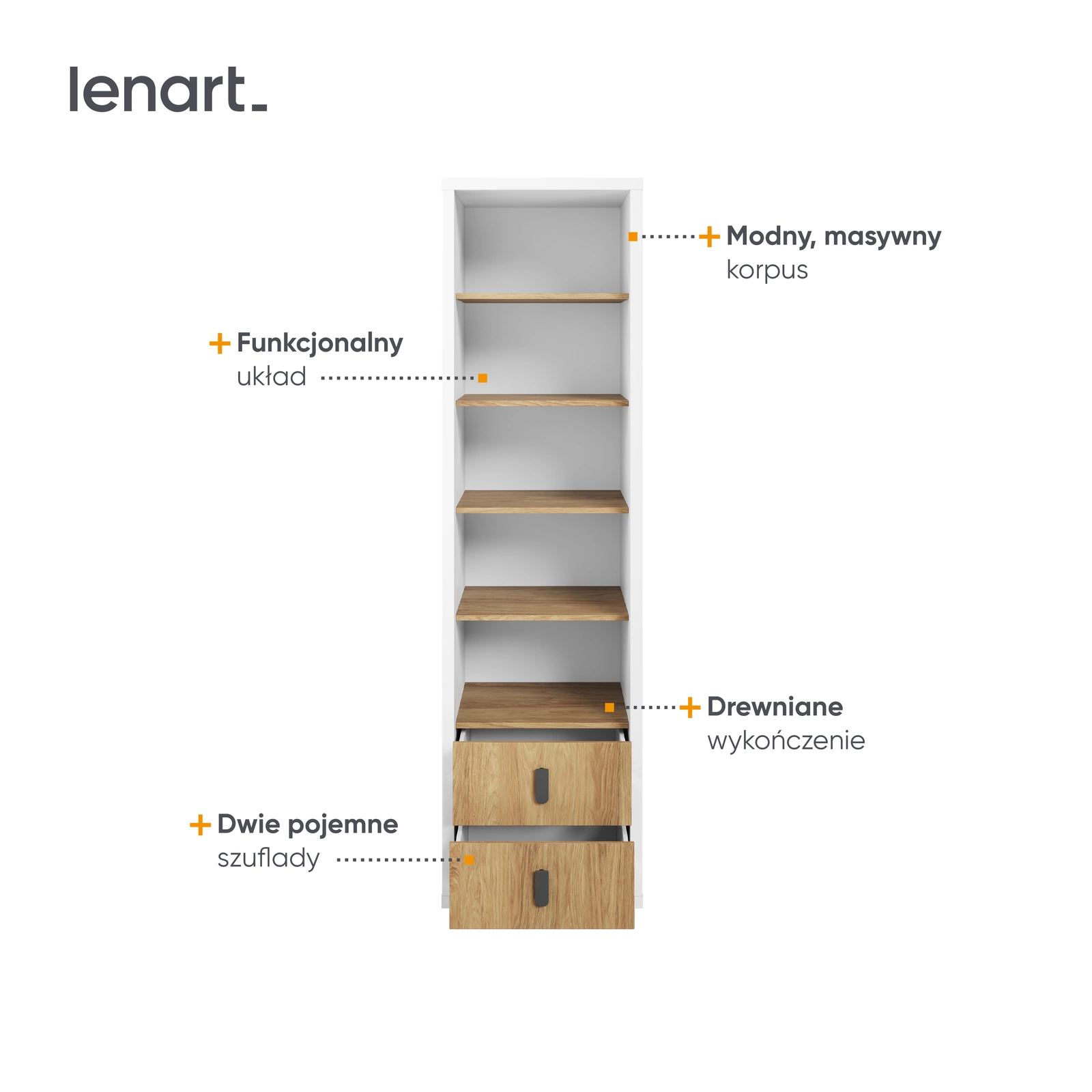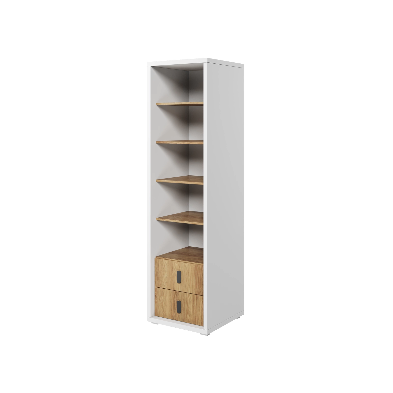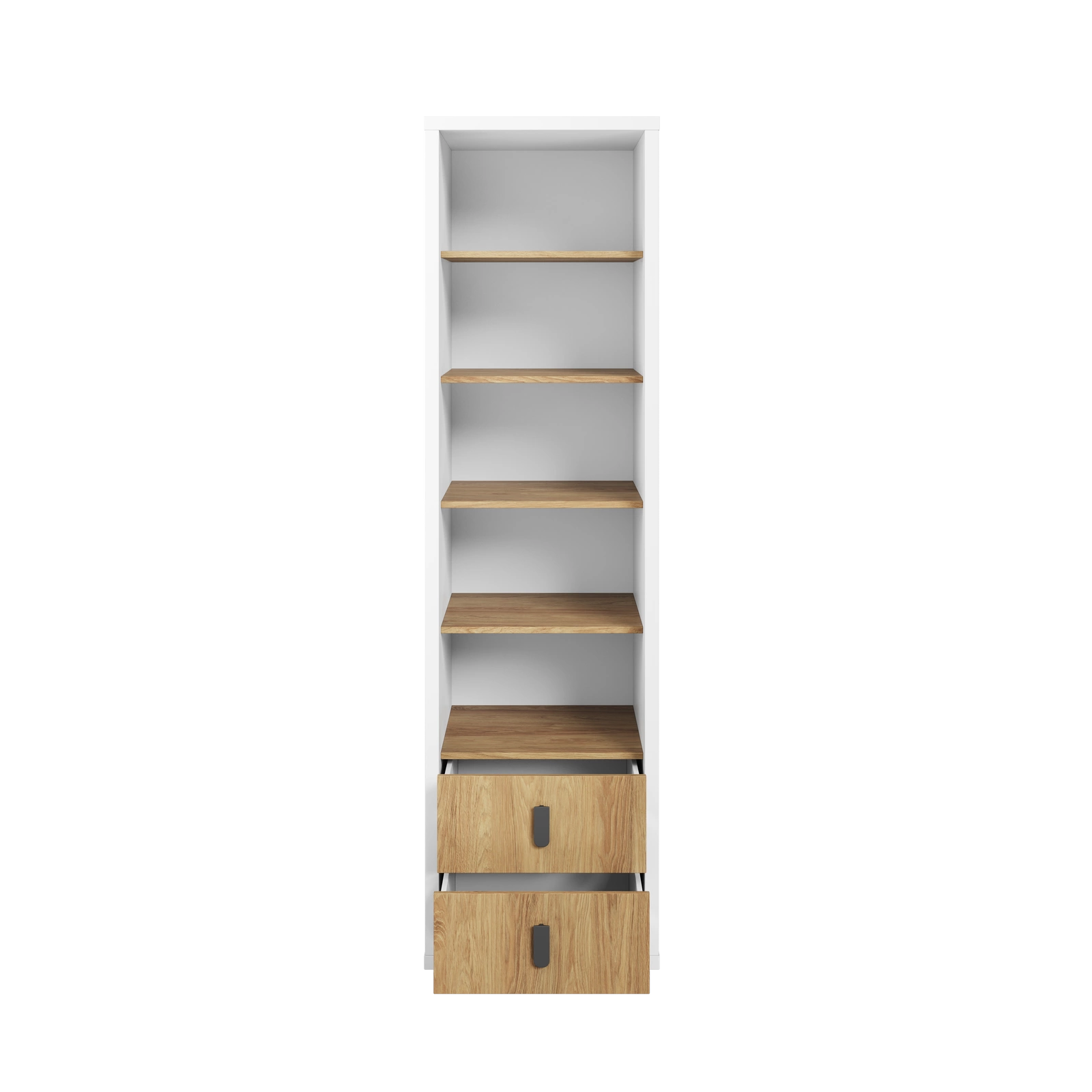 Wysoki regał z kolekcji Simi to połączenie minimalistycznej formy z wyjątkową funkcjonalnością. Wyposażony w pięć pojemnych półek oraz dwie praktyczne szuflady, stanowi idealne rozwiązanie do przechowywania książek, dekoracji, dokumentów czy akcesoriów szkolnych. Ten regał do pokoju młodzieżowego sprawdzi się również w biurze, salonie czy sypialni, nadając przestrzeni przytulności i nowoczesnego charakteru.