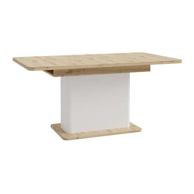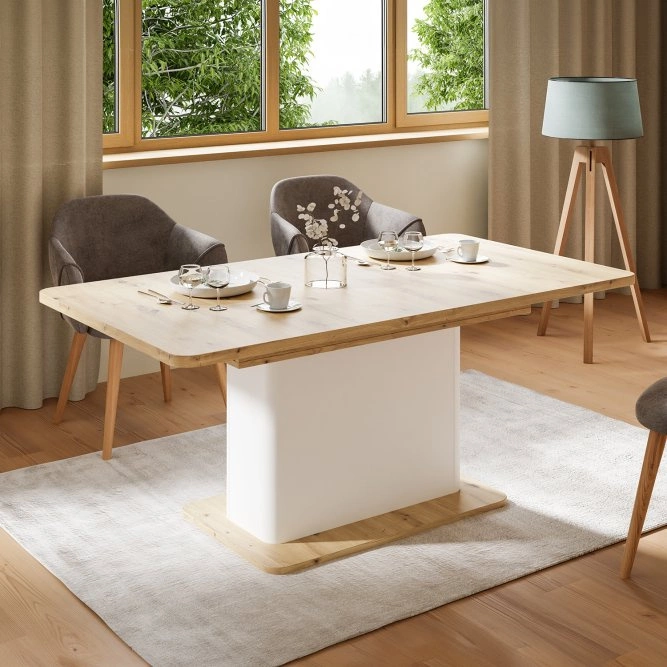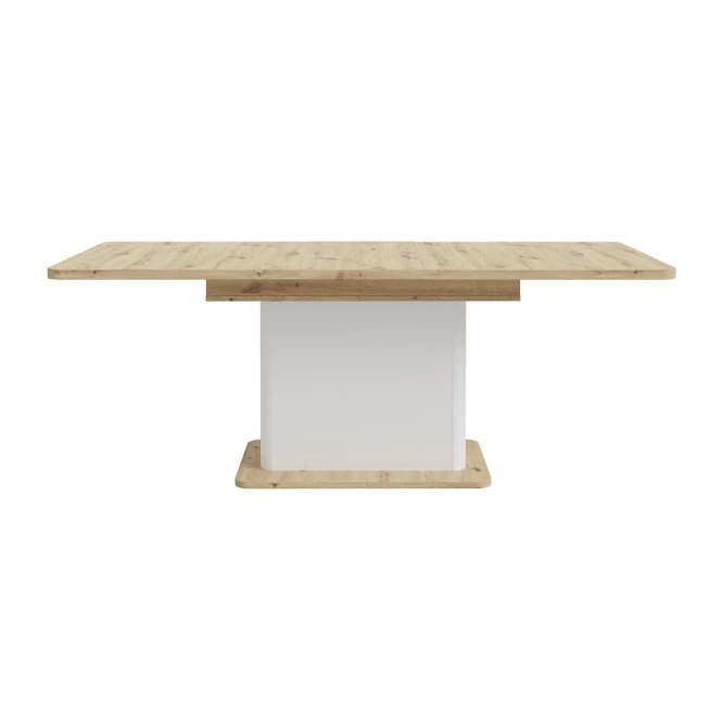 Stół wyróżnia się atrakcyjnym zestawieniem dekorów: biały korpus i blat z wyraźnym usłojeniem Dąb Artisan, które nadają wnętrzu lekkości, świeżości i naturalnego charakteru. Szeroka podstawa zapewnia stabilność, a zarazem nadaje meblowi nowoczesny wygląd. Mimo solidnej konstrukcji, całość zachowuje wizualną lekkość i dobrze komponuje się z pozostałymi elementami kolekcji WARDIOL FORTE.