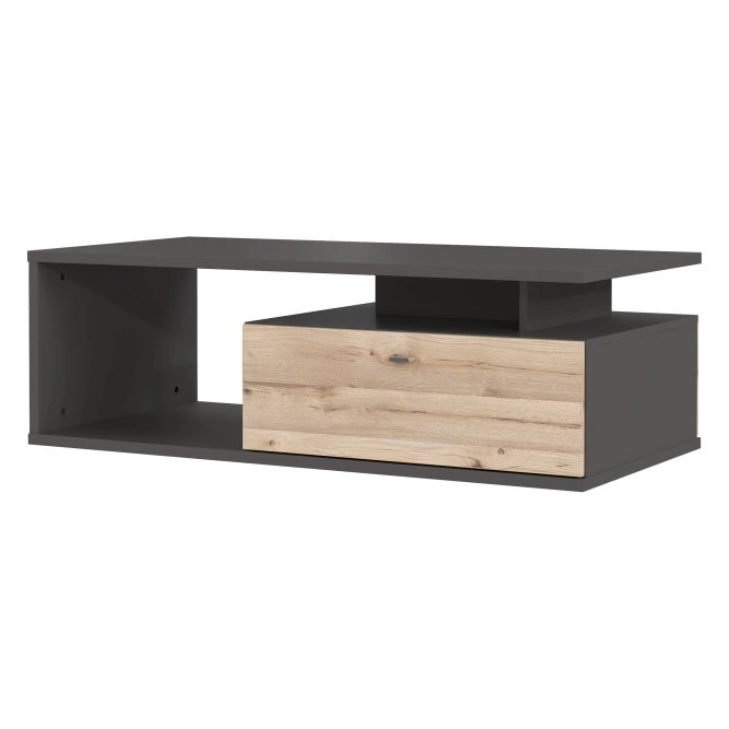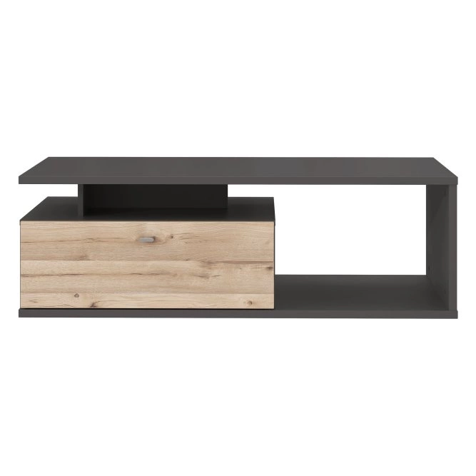 - Nowoczesny stolik kawowy z kolekcji Como w połączeniu grafitu i deski dębowej. Wyposażony w praktyczną półkę oraz szuflady, łączy elegancję z funkcjonalnością, idealny do salonu w stylu loftowym.