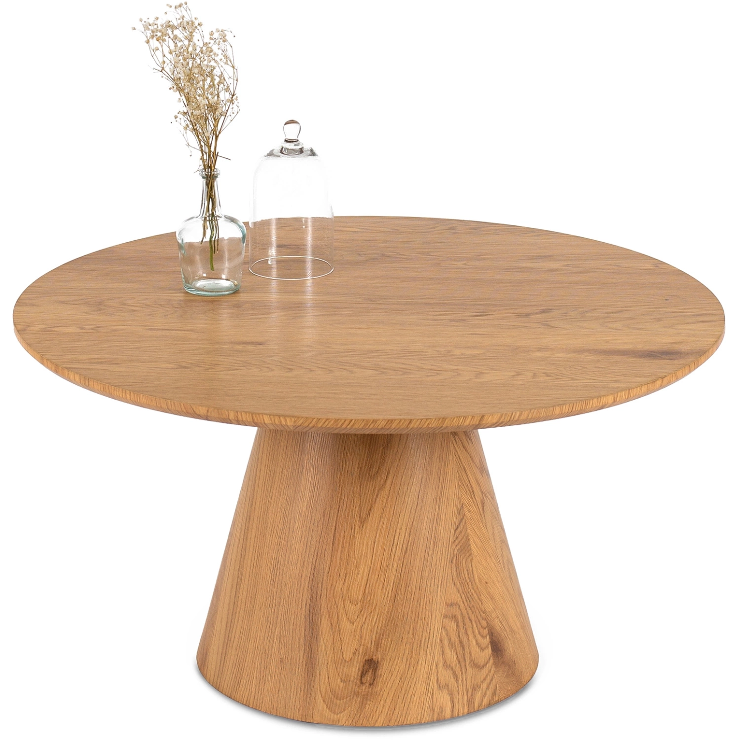- Stolik kawowy w kolorze naturalnego dębu to połączenie elegancji, funkcjonalności i ponadczasowego designu. Okrągły blat o średnicy 80 cm z odpornej na zarysowania płyty MDF oraz stabilna, stożkowa podstawa tworzą efektowny mebel do salonu, biur