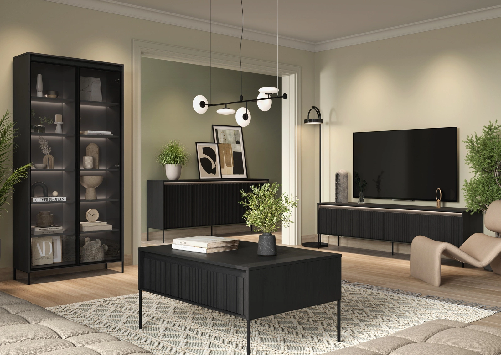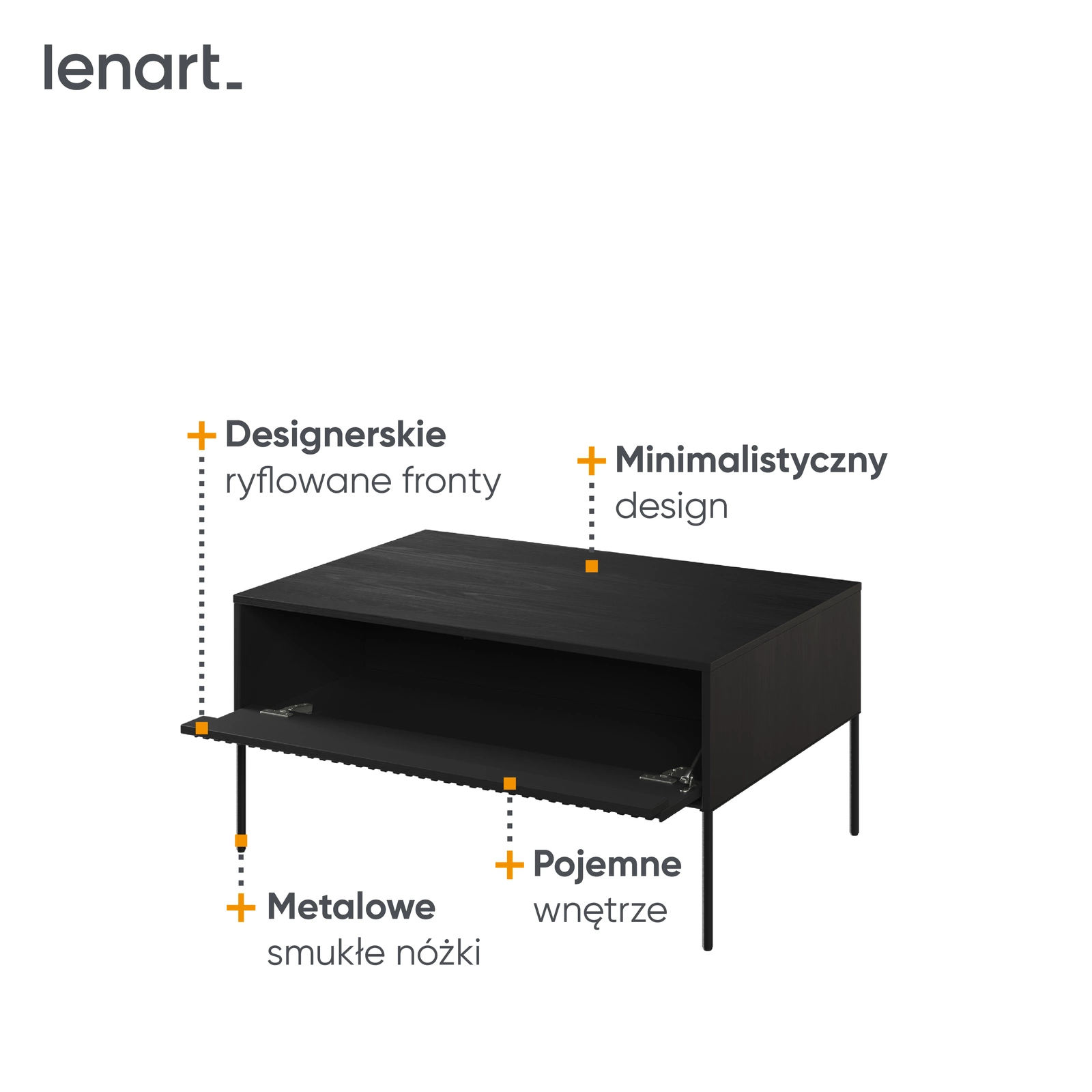 • Zintegrowana półka ukryta za ryflowanym frontem – idealna na piloty, magazyny, ładowarki i inne drobiazgi