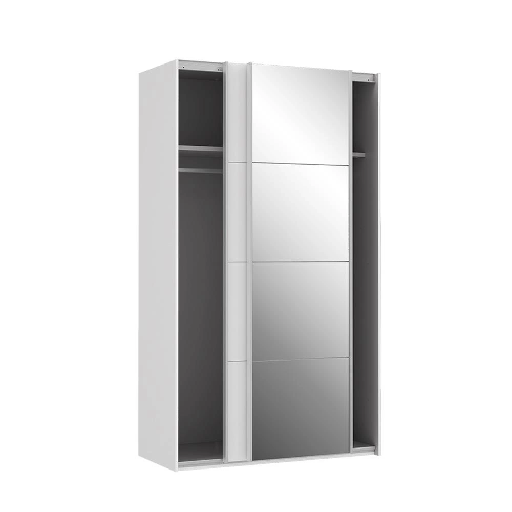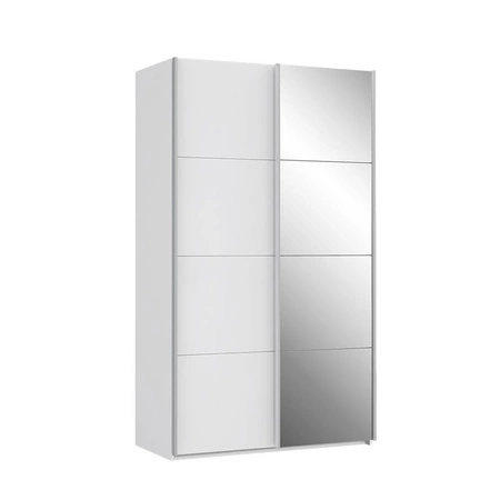 - Kompaktowa szafa przesuwna z kolekcji Sapporo w eleganckim białym połysku. Wyposażona w lustro, półki oraz drążek na ubrania, idealnie sprawdzi się w mniejszych sypialniach lub przedpokojach.