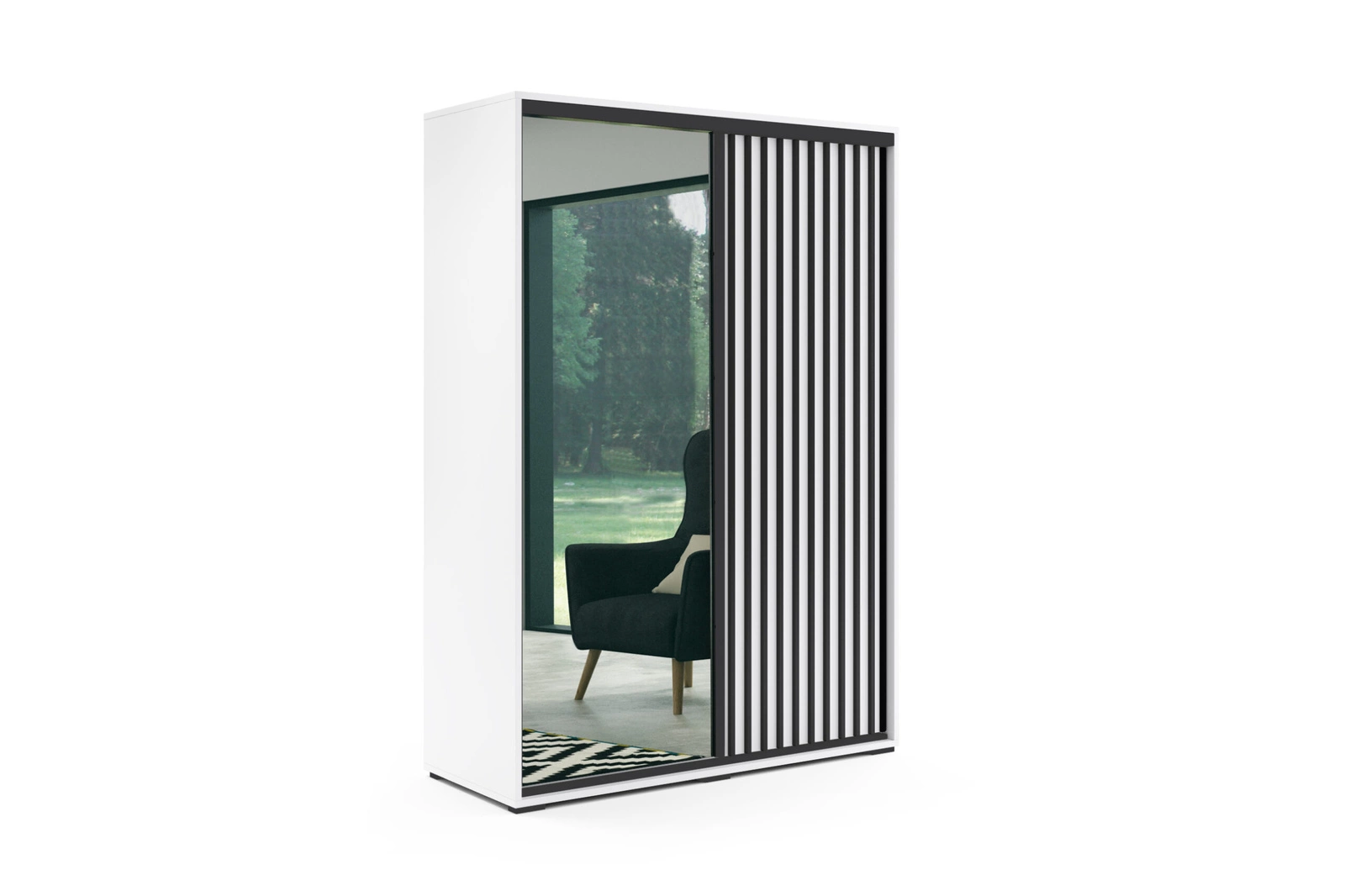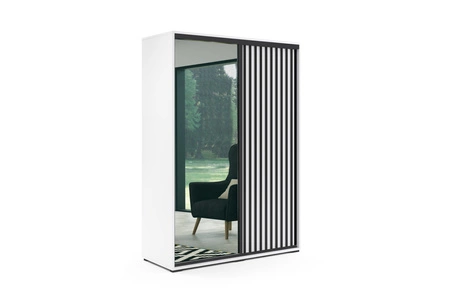 Szafa z lustrem i lamelami Atena 200 została wykonana z dbałością o każdy szczegół. Korpus wykonano z płyty meblowej o grubości 16 mm w kolorze białym, natomiast lamele w kolorze czarnym. Całość tworzy wygodny i trwały mebel, który będzie służył użytkownikowi przez wiele lat.