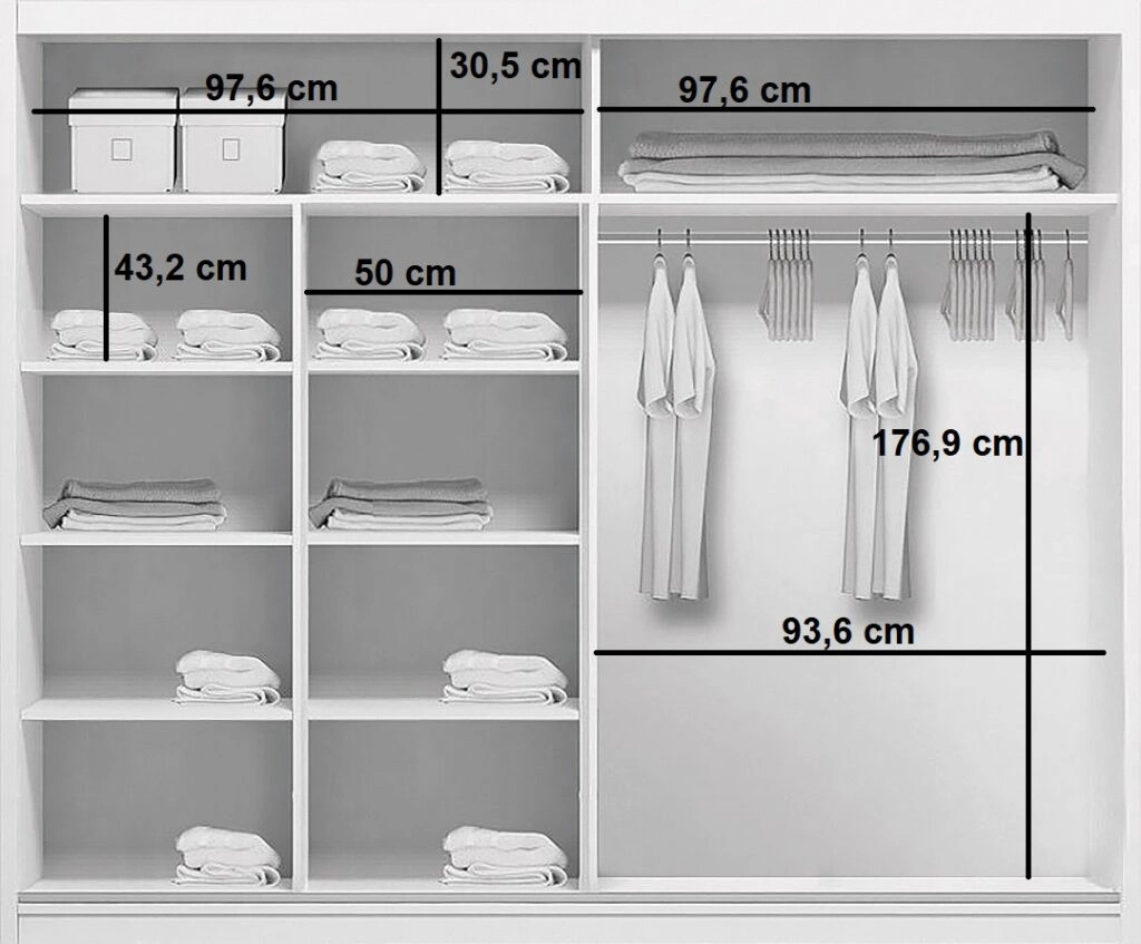 Szafa z lustrem Atena to propozycja, która sprawdzi się w każdym nowoczesnym wnętrzu — sypialni, salonie lub przedpokoju. Liczne półki oraz drążek na ubrania sprawiają, że mebel jest bardzo pojemny, dzięki czemu może zastąpić nawet niewielką garderobę.