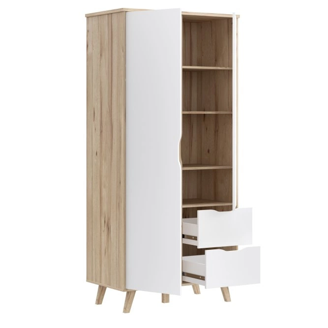 - Szafa z kolekcji Vankka to połączenie jasnego dębu z białym frontem sprawia, że wnętrze staje się jaśniejsze i bardziej uporządkowane. Praktyczne półki, drążek i dwie pojemne szuflady pomogą utrzymać ład każdego dnia.