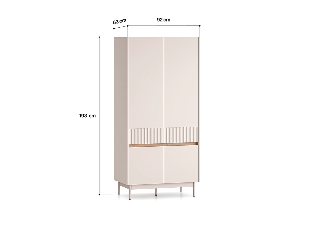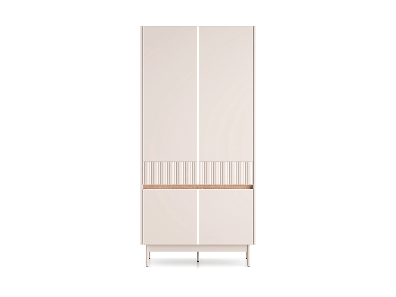 • Szafa Dunea 01 to czterodrzwiowy mebel z drążkiem na całej szerokości i pojemną dolną wnęką, idealny do przechowywania ubrań i tekstyliów. Nowoczesne wykończenie w kolorze kaszmirowym z dodatkiem Dąb Cremona oraz ciche domykanie i metalowe nóżki łączą fun