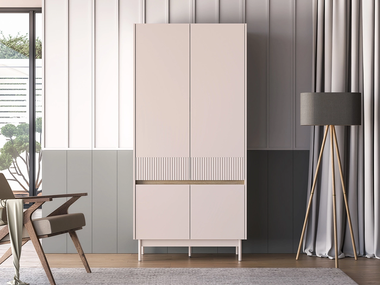 Czterodrzwiowa szafa Dunea 01 to funkcjonalny mebel, który doskonale sprawdzi się w sypialni, garderobie, a nawet w nowoczesnym przedpokoju. Zapewnia przestronne i wygodne przechowywanie ubrań, dodatków oraz domowych tekstyliów, zachowując przy tym estetyczny, ponadczasowy wygląd.