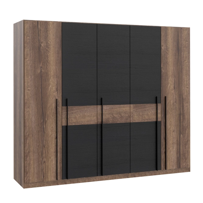 Nieszablonowa sypialnia to marzenie wielu osób. Jeśli zależy Ci na wnętrzu, które łamie dotychczas wypracowane schematy, szafa uchylna duża, pojemna do sypialni Bellevue dąb szlachetny Forte z pewnością spełni Twoje oczekiwania. Odważne połączenie dębu naturalnego i czarnego oraz wyraziste, czyste linie to cechy, które wyróżniają ten mebel spośród innych.